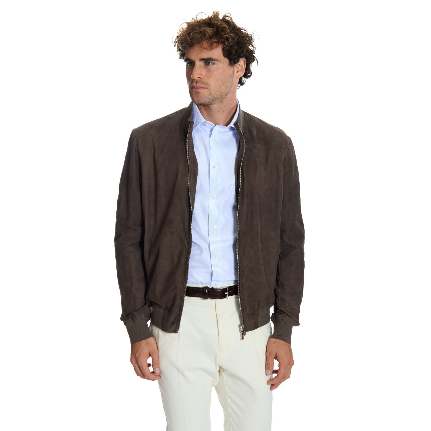 Unlined Soft suede leather jacket. Standing collar with two pockets embellished with iconic micro design printed of E. Marinella Maison. Knitted hem and cuffs. A great fusion of style.