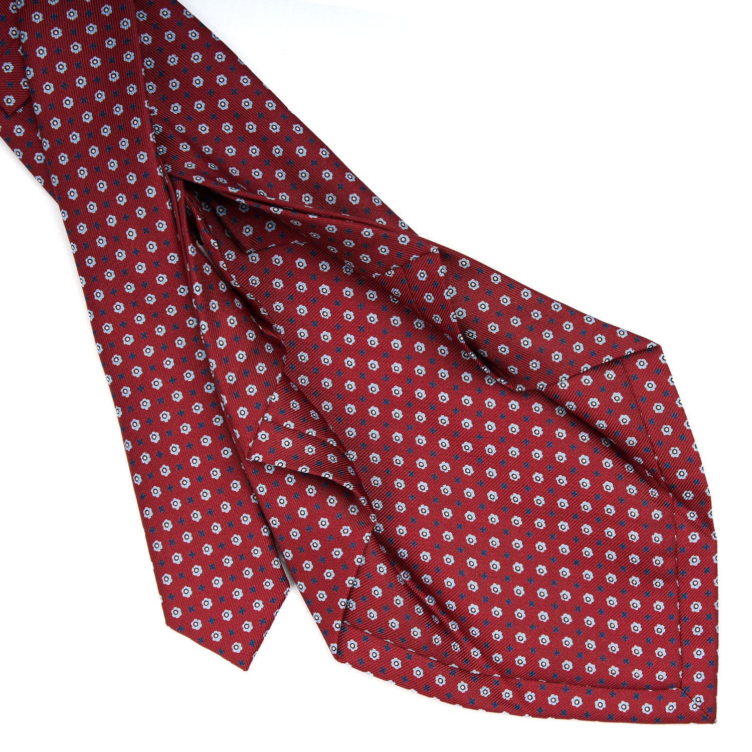 The seven-fold tie from E.Marinella is a completely artisanal product from the hand-printing of the silk to individual cutting of each piece of fabric to the closing of the finished product. This is a particularly precious tie because of the greater amount of silk used: the silk square is folded on itself seven times, giving the tie a fuller consistency even at the height of the knot and weightiness.