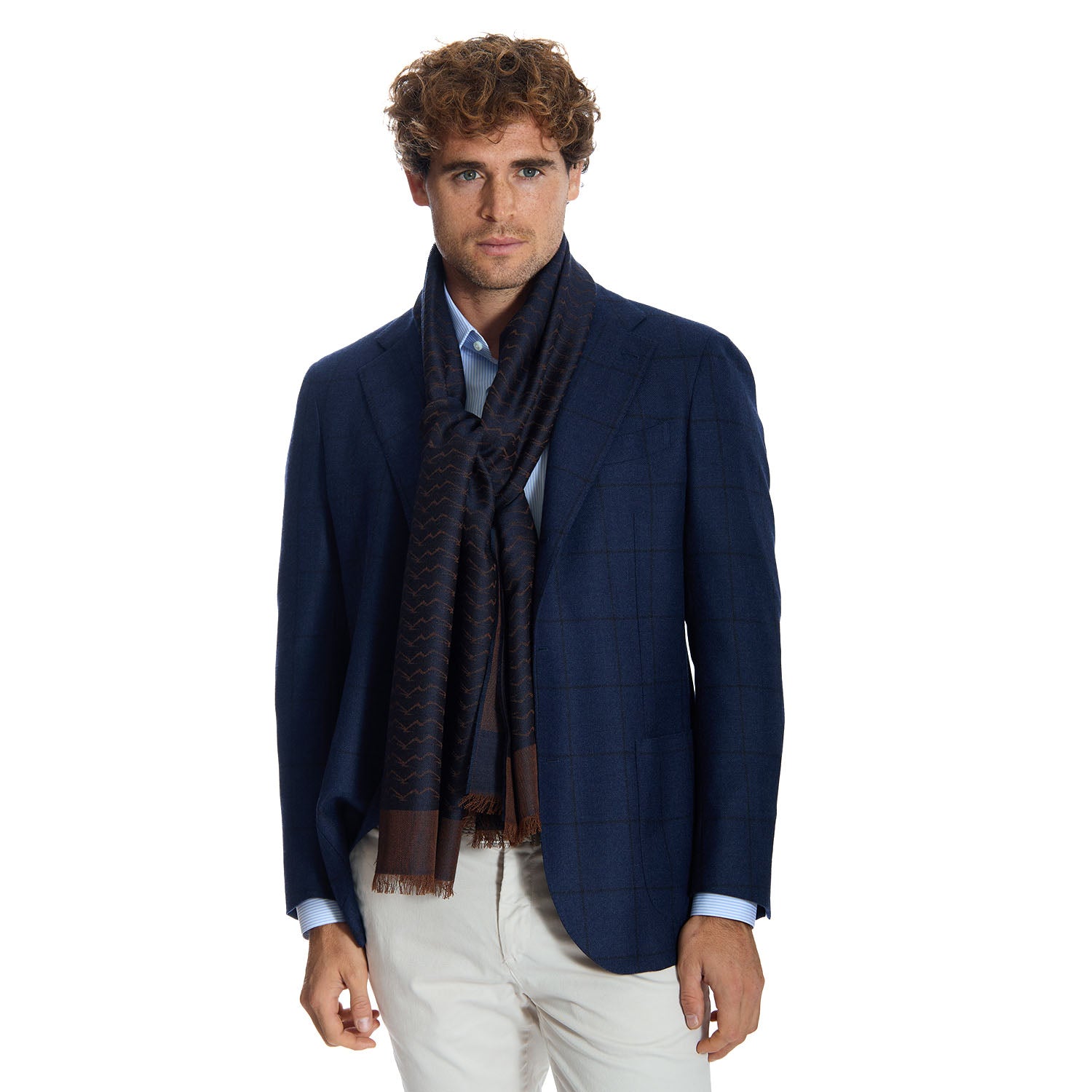 Wool and silk scarf embellished with a pattern that recalls a stylized Vesuvius outline with a small fringe at the end. Thanks to its lightness it is possible to tie it, or wrap it, around the neck.