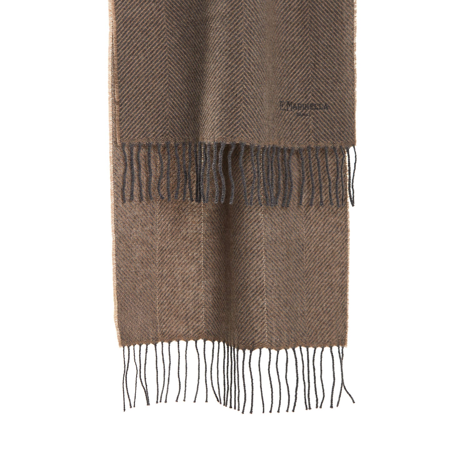 Cashmere scarf. with tone-on-tone embroidered E.Marinella logo and final fringe. Soft and enveloping, with classic and traditional lines to be paired with work or casual outfits during the cold winter months.