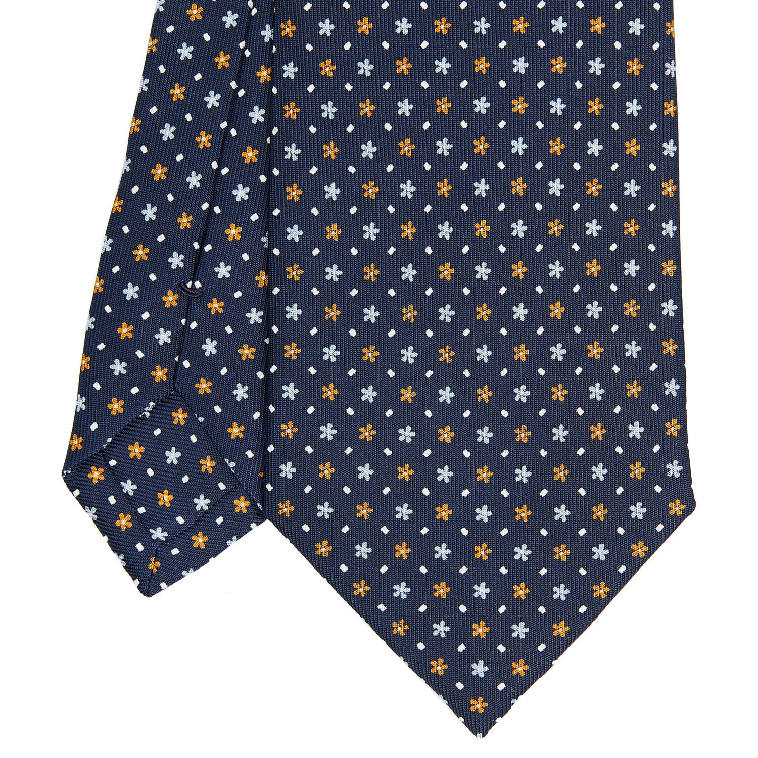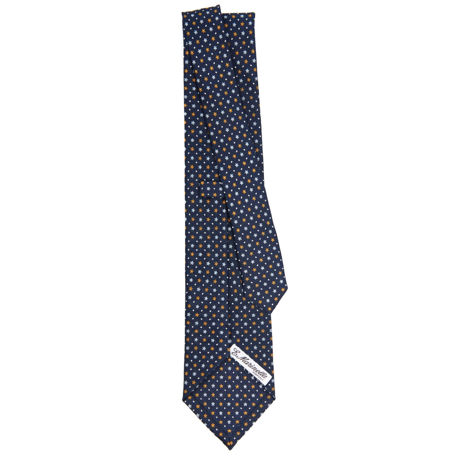 The E. Marinella tie is a hand-made product. From the hand-printed silk, to the individual cutting of each square, to the hand-closing of the final product. Characterised by rich colours, never excessive and by floral or geometric micro-designs. The tie is tipped with the same fabric as an extra detail. 3 fold tie