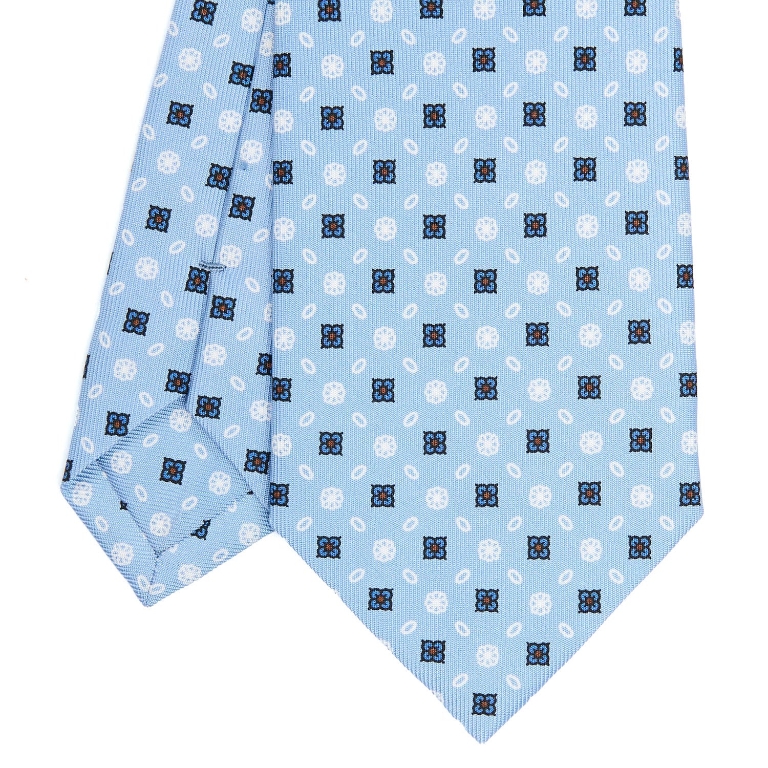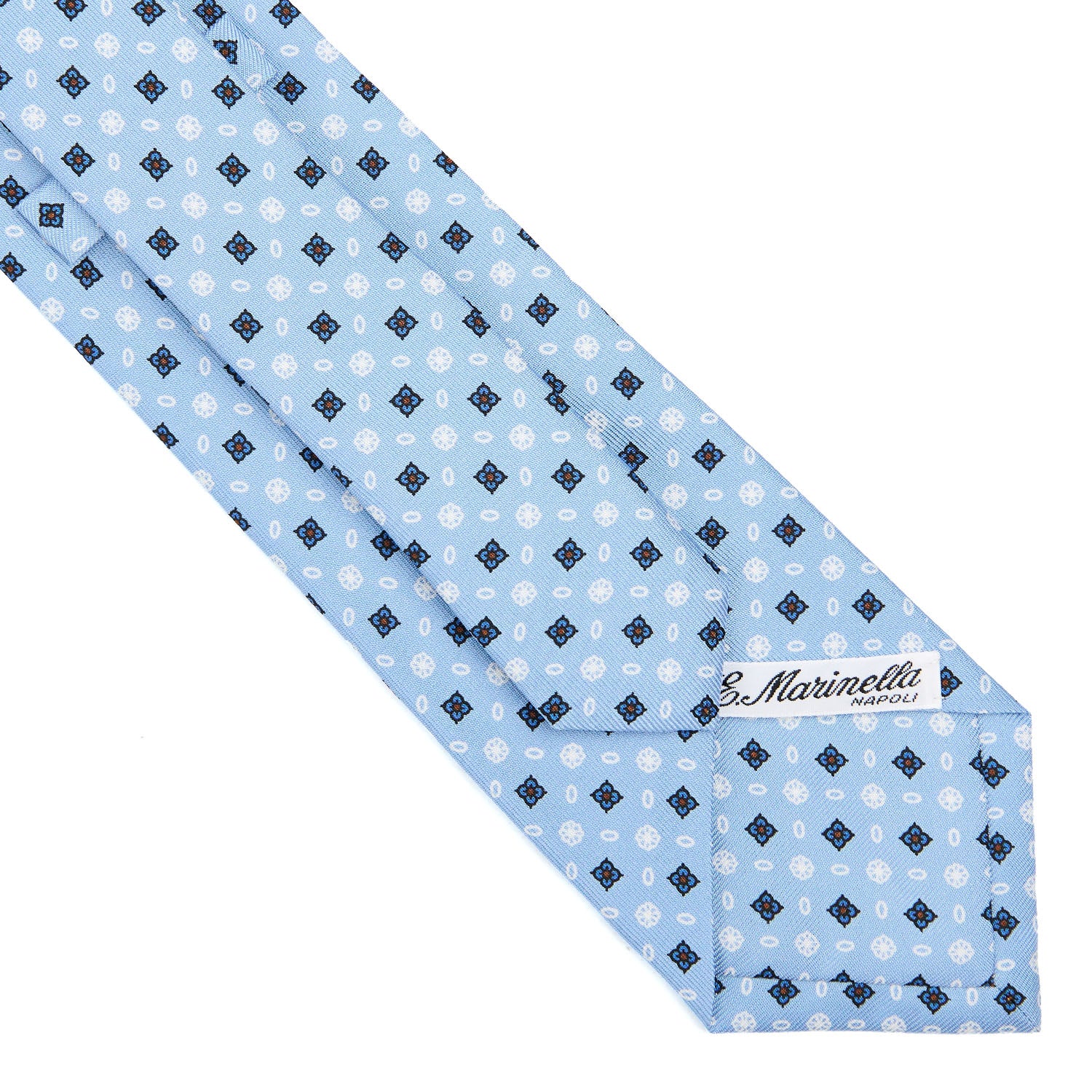 The E. Marinella tie is a hand-made product. From the hand-printed silk, to the individual cutting of each square, to the hand-closing of the final product. Characterised by rich colours, never excessive and by floral or geometric micro-designs. The tie is tipped with the same fabric as an extra detail. 3 fold tie