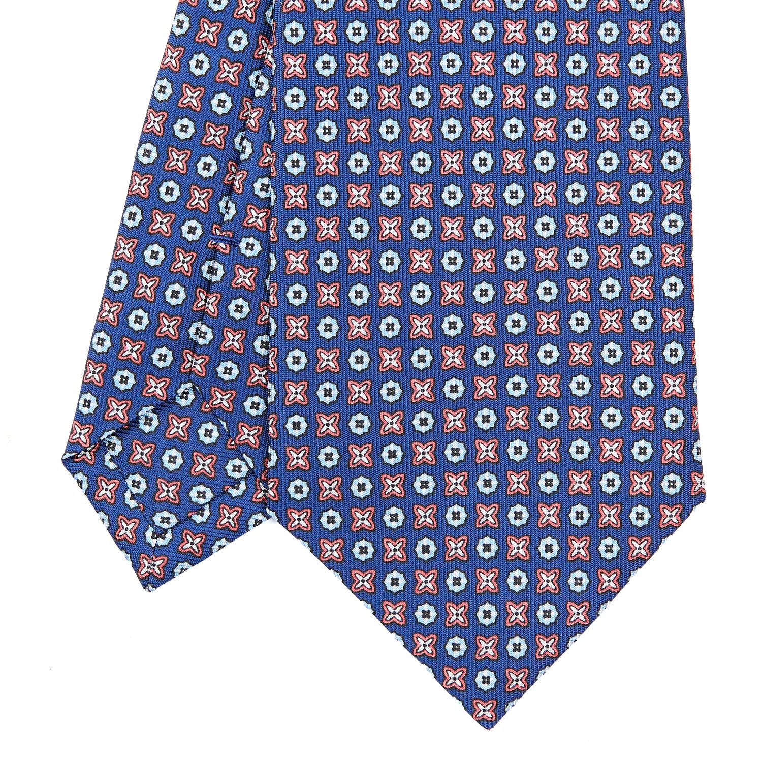 The classic three-fold silk tie, in deep midnight blue with a delicate floral motif, is crafted following traditional techniques handed down through generations—an expression of elegance that endures beyond time and trends. Alongside it, our iconic Christmas Bauble, created using silk remnants from ties produced in our atelier. Each inlay preserves patterns and colors once destined for our collections, giving new life to fabrics that carry the unmistakable imprint of the Maison. A small work of art, unique by its very nature.
