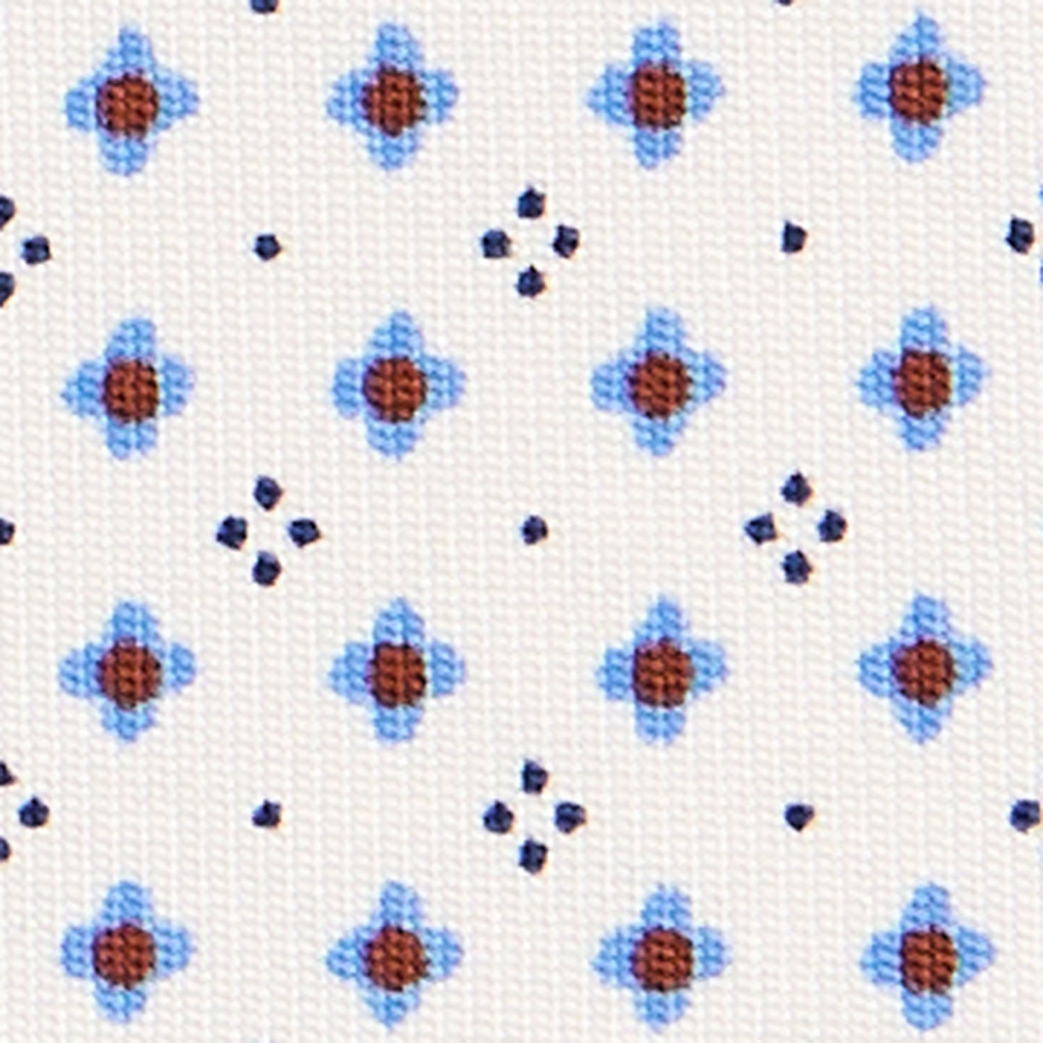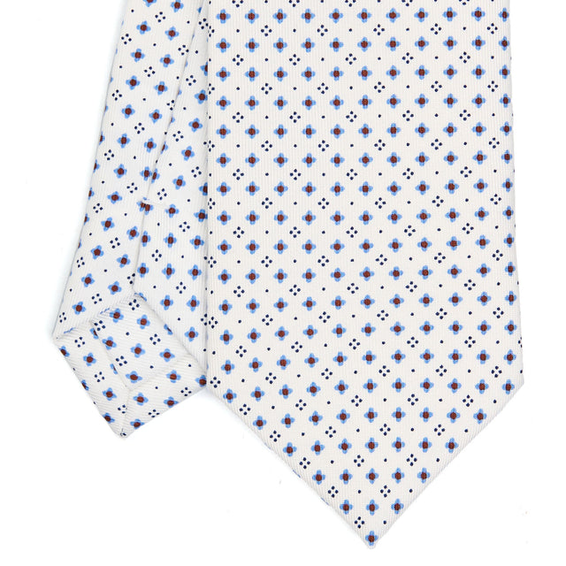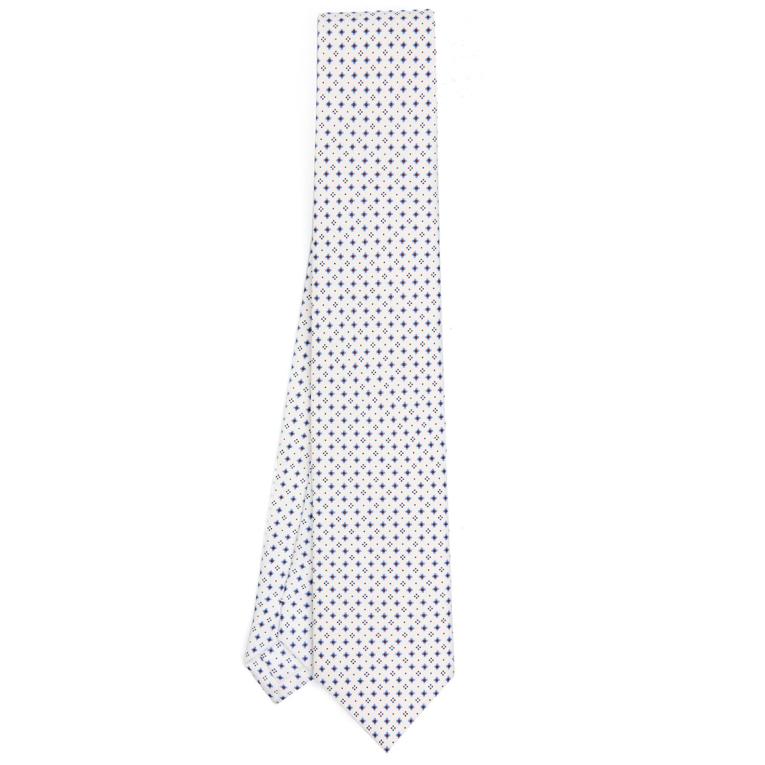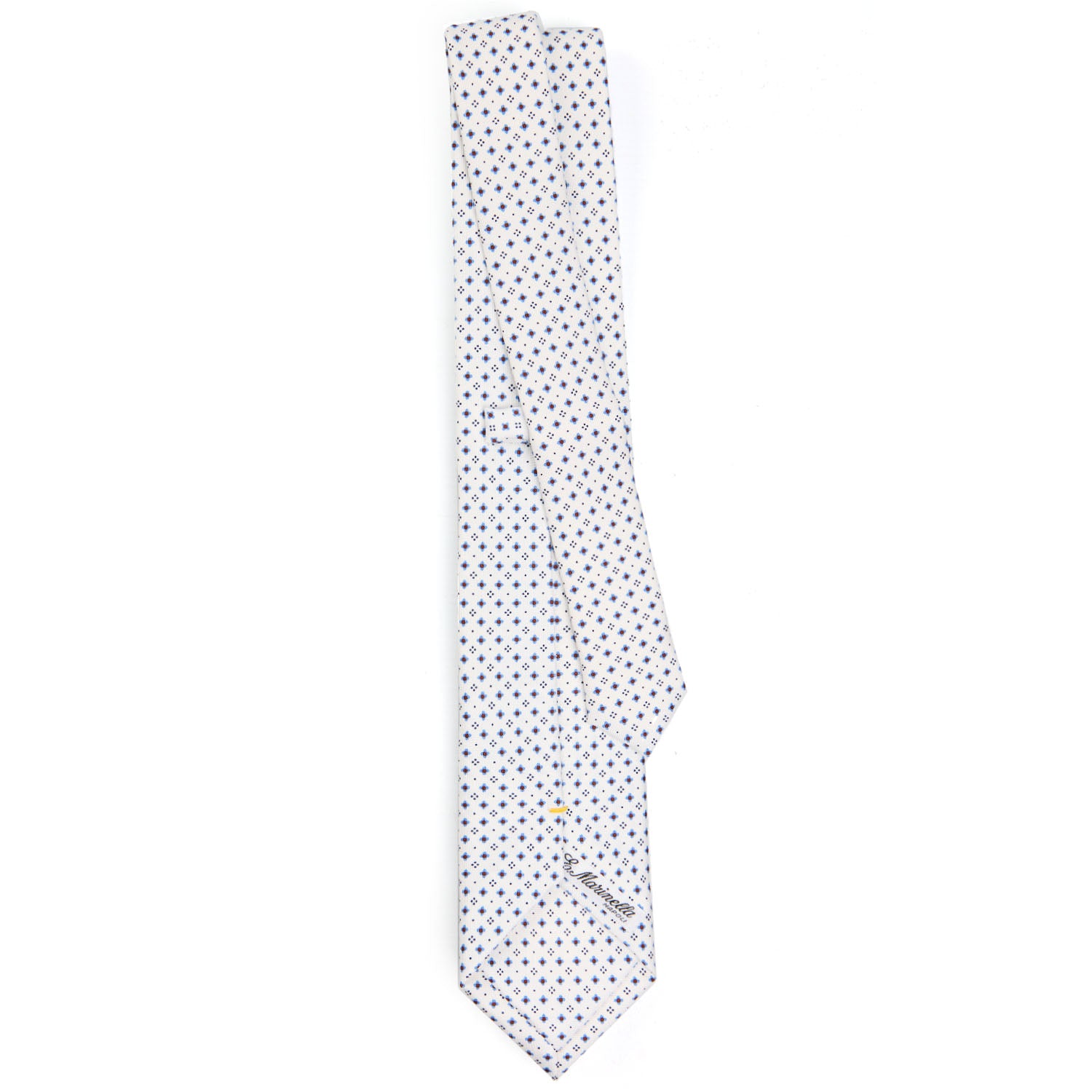 The E. Marinella tie is a hand-made product. From the hand-printed silk, to the individual cutting of each square, to the hand-closing of the final product. Characterised by rich colours, never excessive and by floral or geometric micro-designs. The tie is tipped with the same fabric as an extra detail.