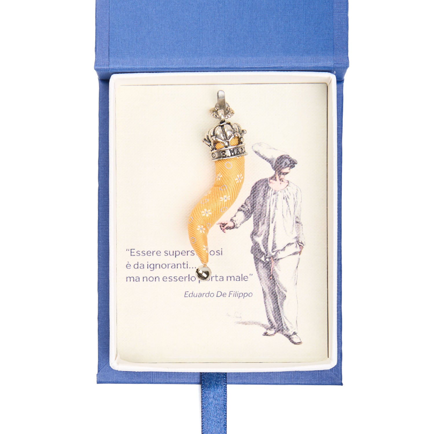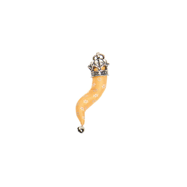 The E. Marinella lucky charm horn is crafted from the Maison's precious hand-printed silks, transforming high-quality fabrics into traditional Neapolitan amulets. Adorned with silver-plated metal finishes and presented in elegant gift boxes, these horns are the perfect symbol of elegance and good fortune. Made in Italy