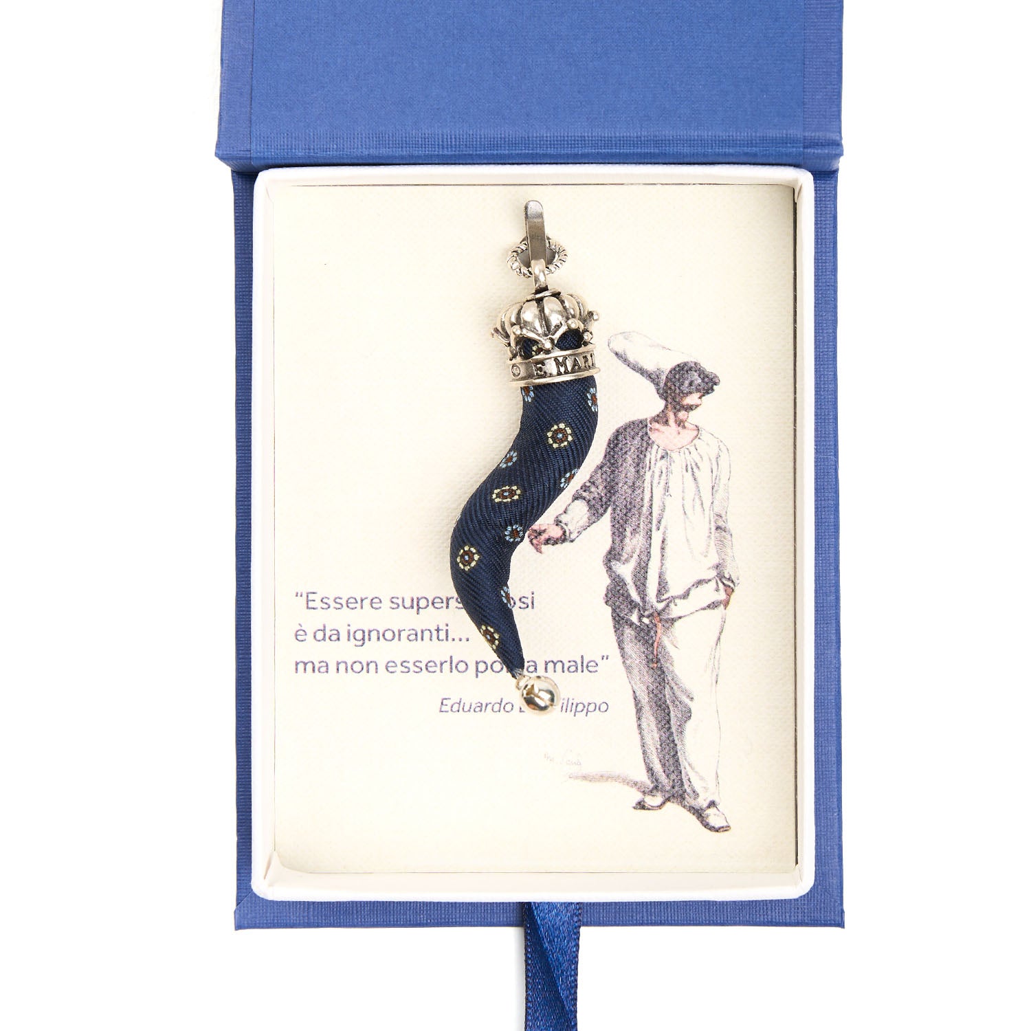 The E. Marinella lucky charm horn is crafted from the Maison's precious hand-printed silks, transforming high-quality fabrics into traditional Neapolitan amulets. Adorned with silver-plated metal finishes and presented in elegant gift boxes, these horns are the perfect symbol of elegance and good fortune. Made in Italy