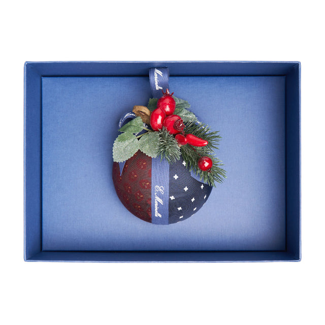 Add a touch of elegance to your Christmas tree with the E. Marinella Christmas Bauble Box. This exclusive box celebrates Italian craftsmanship with our iconic Christmas Bauble, meticulously handmade using silk from three unique ties that, while not intended for sale, find new life in this precious ornament. The E. Marinella Christmas Bauble is more than just a decoration; it is a symbol of tradition and sustainability, embodying the Maison's eco-friendly commitment. Enhance your holiday décor with a refined and stylish touch, creating a unique and unforgettable atmosphere. Celebrate Christmas with style and tradition with the E. Marinella Christmas Bauble Box.