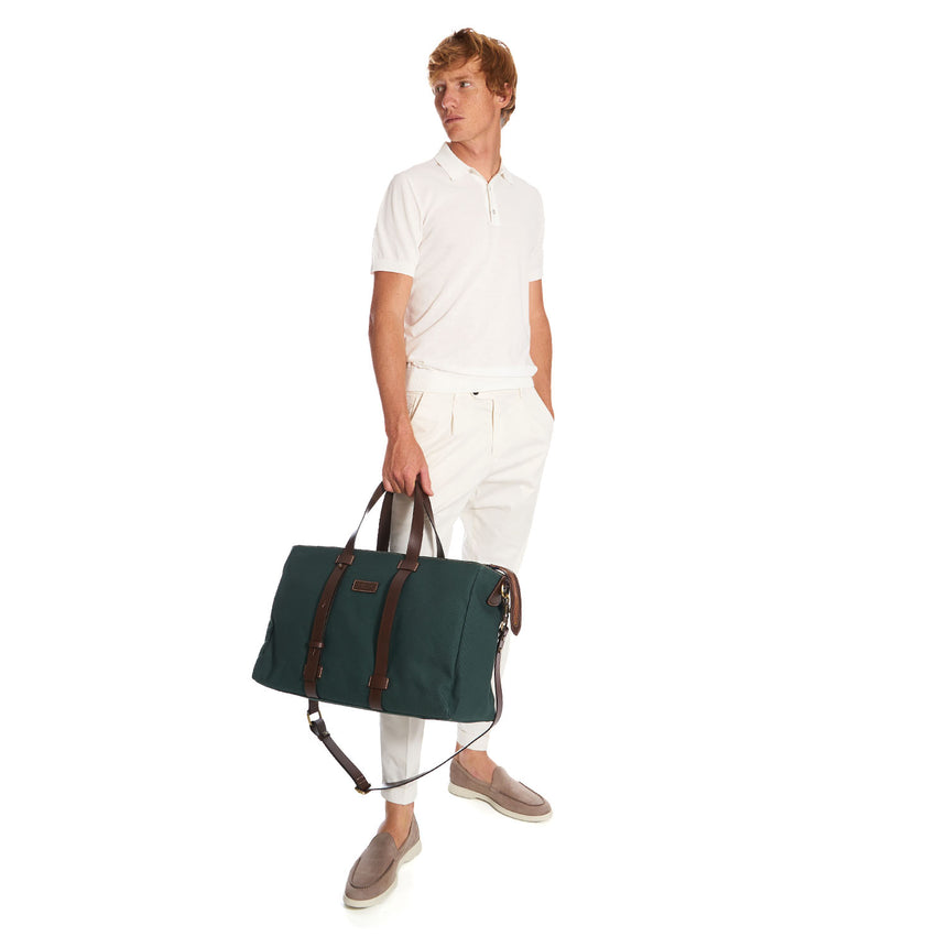 Weekend bag in durable canvas with leather trims, featuring a secure zip closure. Equipped with a removable and adjustable strap, it can be comfortably carried on the shoulder or by hand—perfect for travel and short getaways.