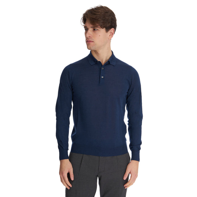 Long-sleeved polo shirt with three mother of pearl buttons. Made of fine cashmere and silk , which gives the garment a soft and natural hand for a confortable elegance. For a metropolitan look to be combined with a casual jacket or simply trousers, for a relaxed style. Regular fit.
