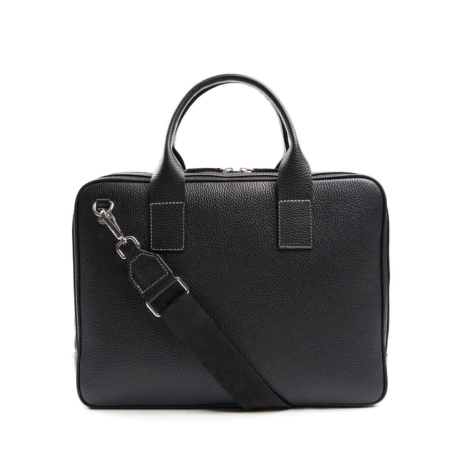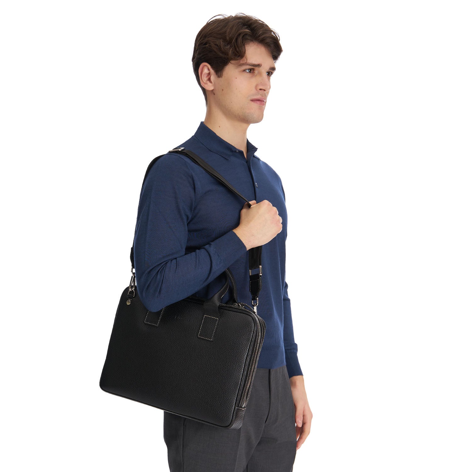 Elegant briefcase in premium textured leather, designed to carry your laptop and documents with style. Features an adjustable and removable shoulder strap, multiple internal compartments, and refined finishes for a professional look.