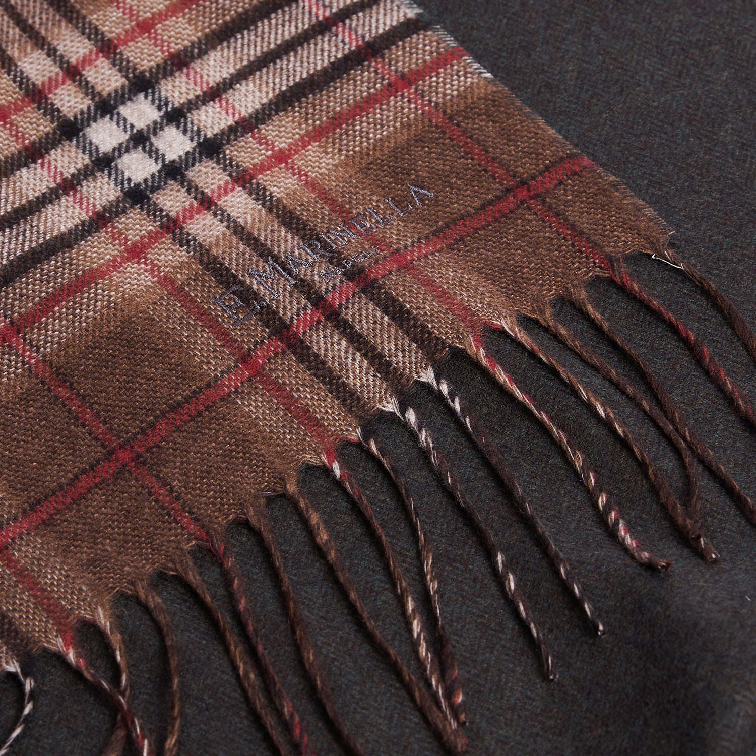 Silk and cashmere scarf with soft and warm touch finished with fringes at the bottom and embroidered logo tone on tone.