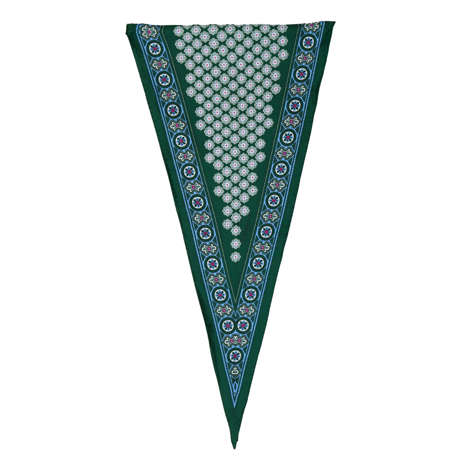 The E.Marinella diamond-shaped scarf is made of fine silk and embellished with floral and geometric micro-pattern. Perfect to match with polo tricot and shirts, add a touch of style to any outfit. Completely finished by hand. Made in Italy