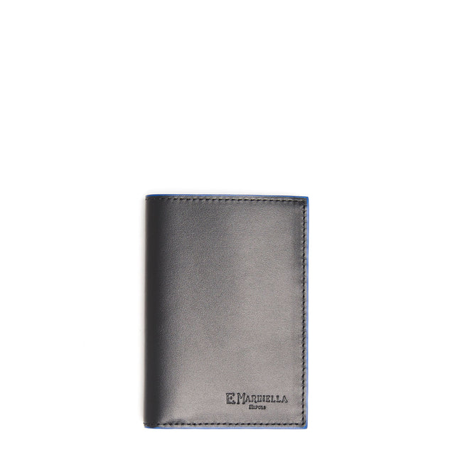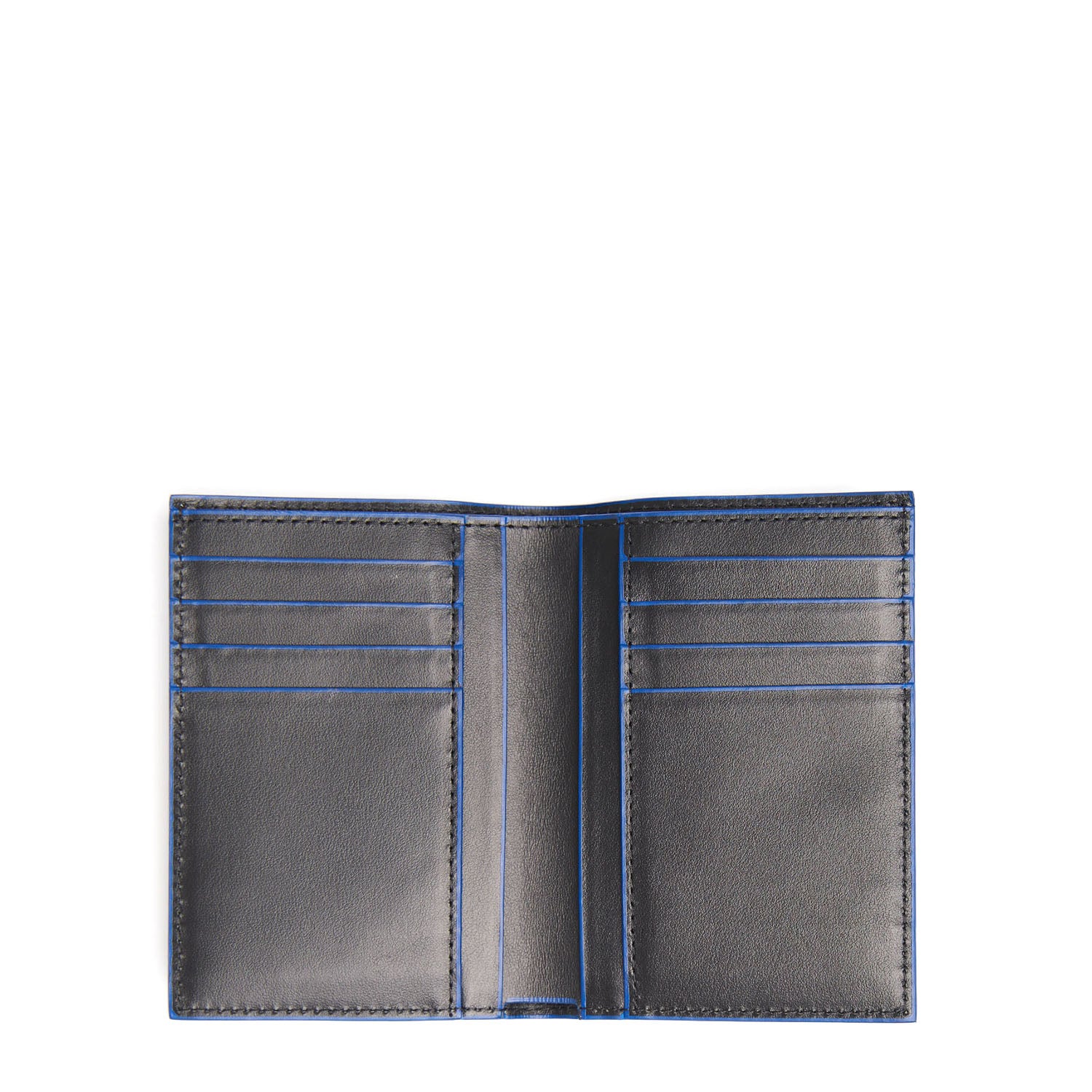 Vertical wallet in smooth calfskin with contrasting finishes. Inside there are twelve compartments for credit cards and one for banknotes. Made in Italy
