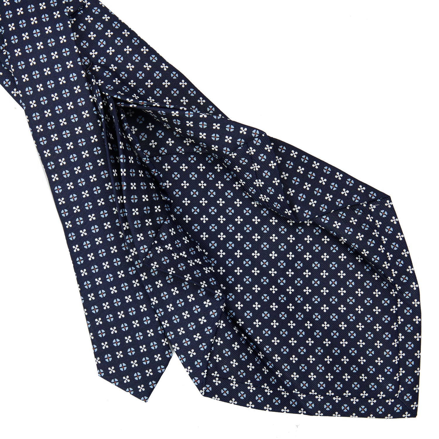 The seven-fold tie from E.Marinella is a completely artisanal product. from the hand-printing of the silk. to individual cutting of each piece of fabric. to the closing of the finished product. This is a particularly precious tie. because of the greater amount of silk used: the silk square is folded on itself seven times. giving the tie a fuller consistency. even at the height of the knot. and weightiness.