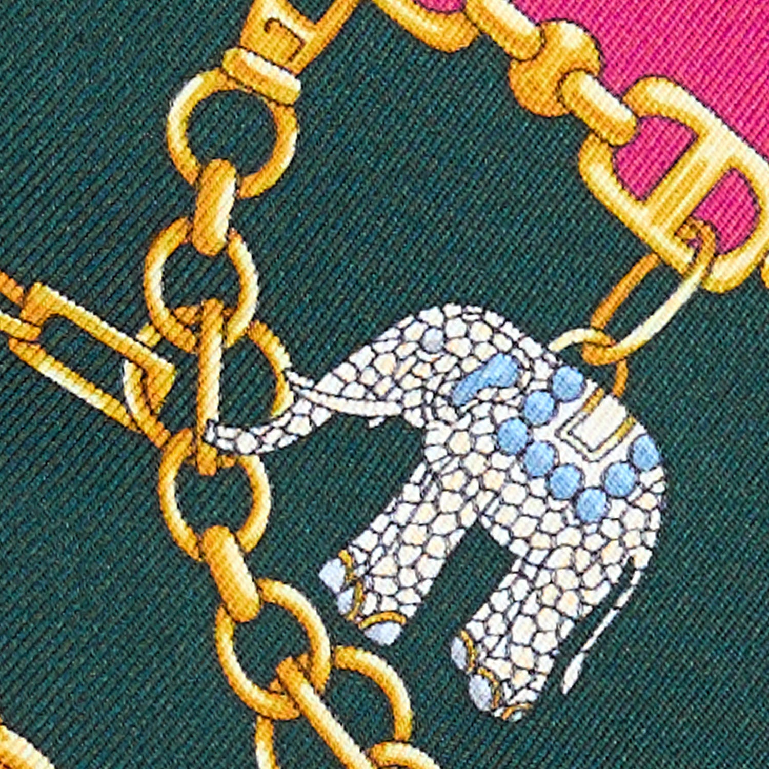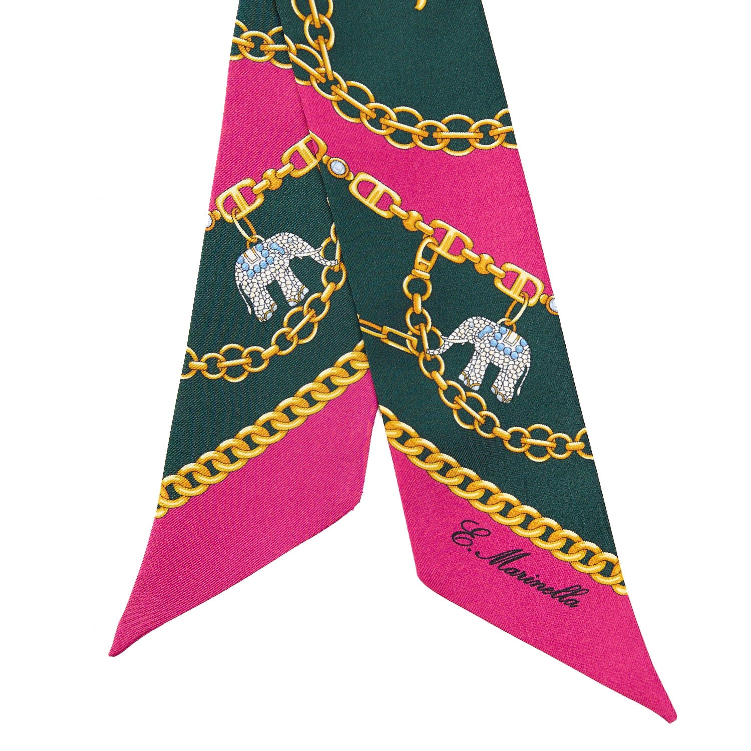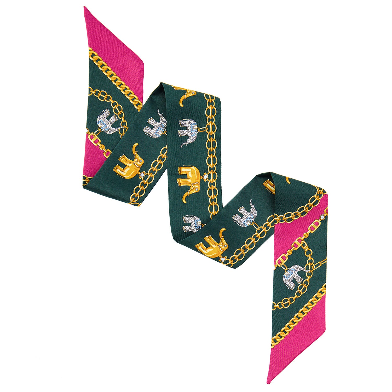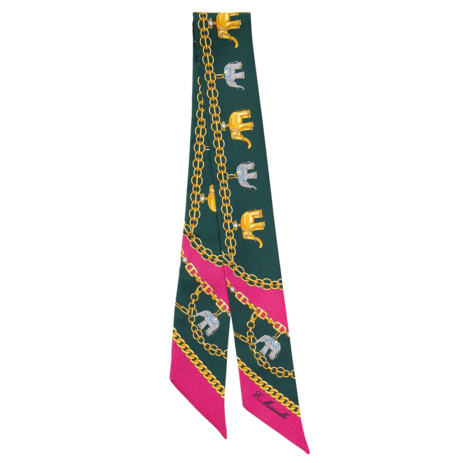 Entirely crafted in printed silk and inspired by the Lucky Elephants print on the E. Marinella silk scarf that evokes a beloved symbol of protection, strength, and good fortune for the Maison. Wear it in your hair, around your wrist, or as a stylish detail on your bags.