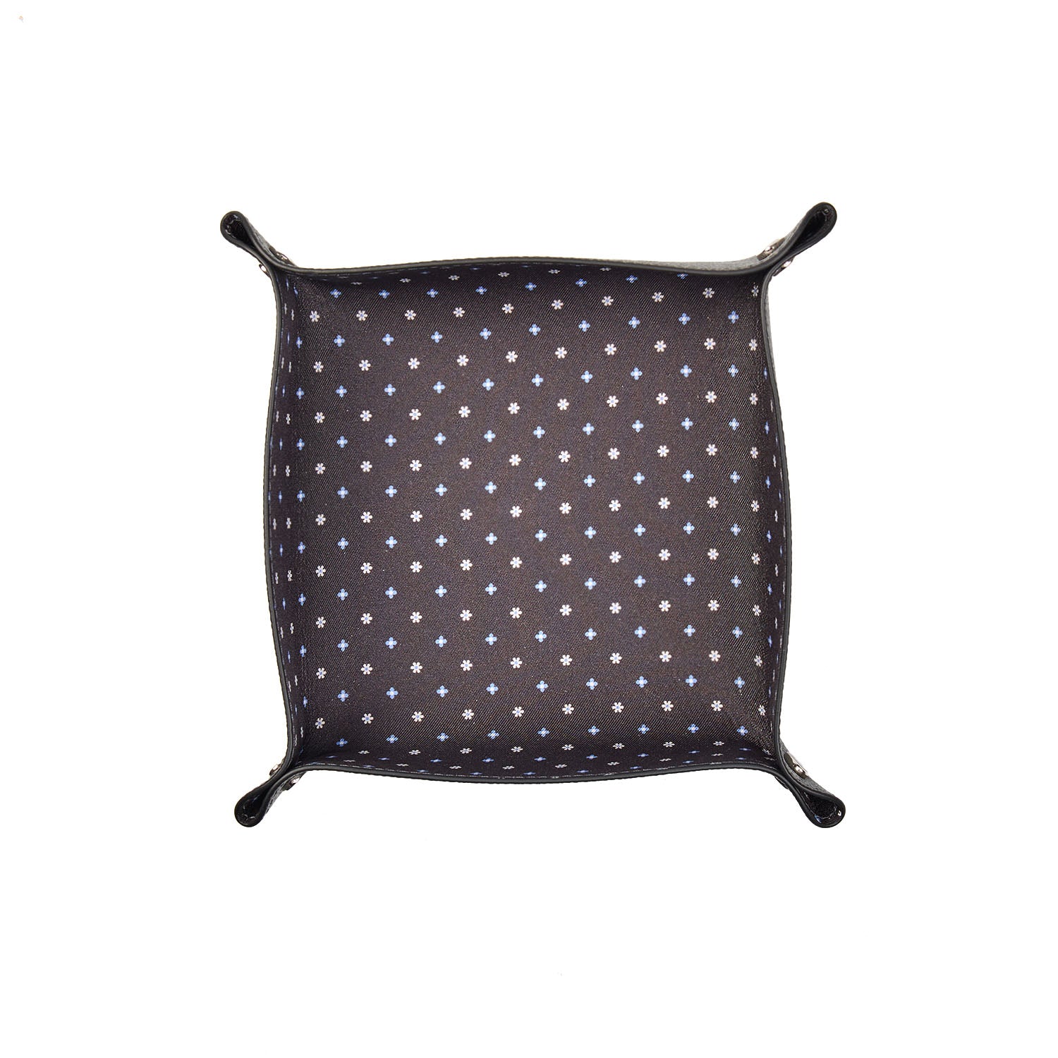 Large leather valet tray with a silk interior featuring the signature micro-pattern of the Maison. Corners secured by four metal rivets. A refined yet functional decorative item.