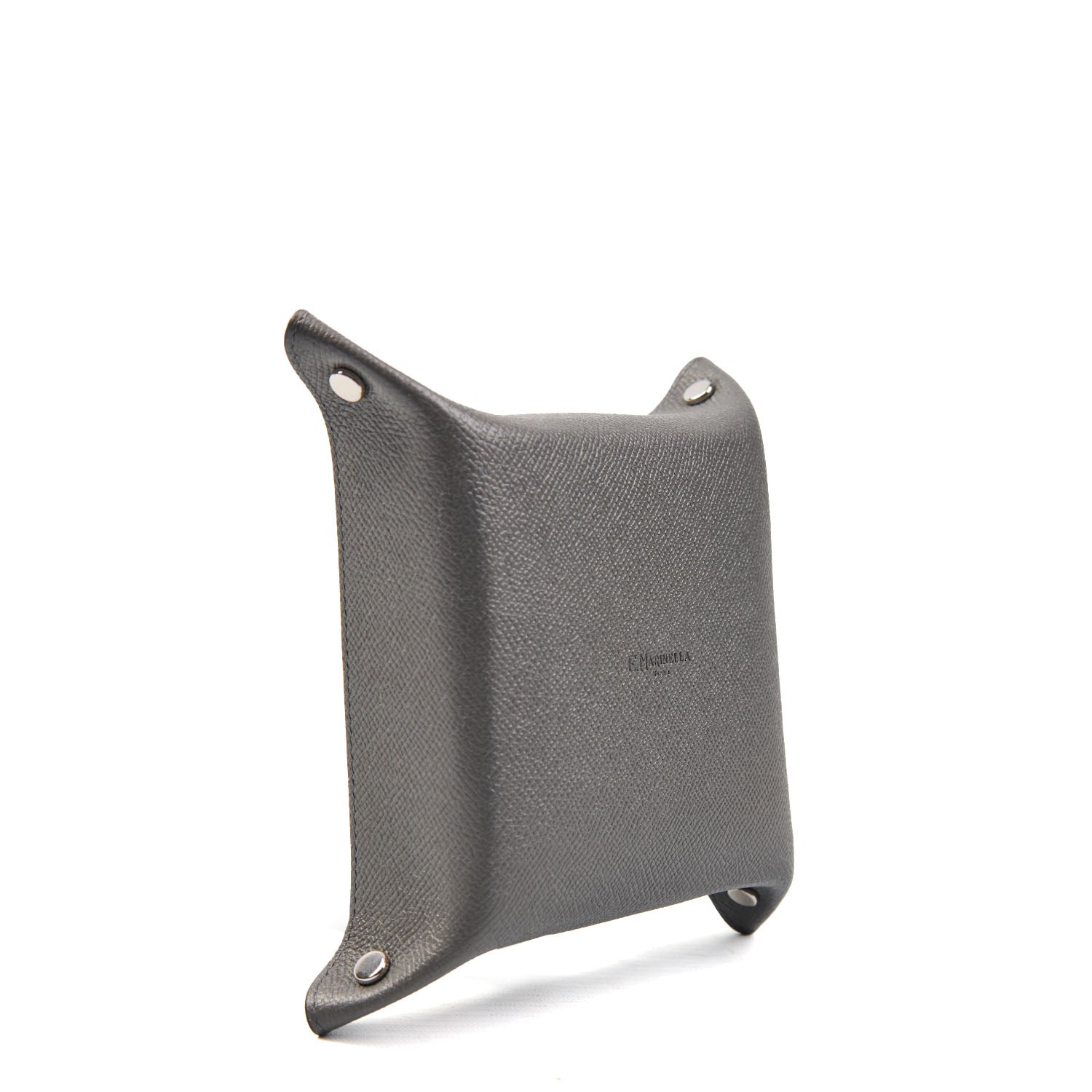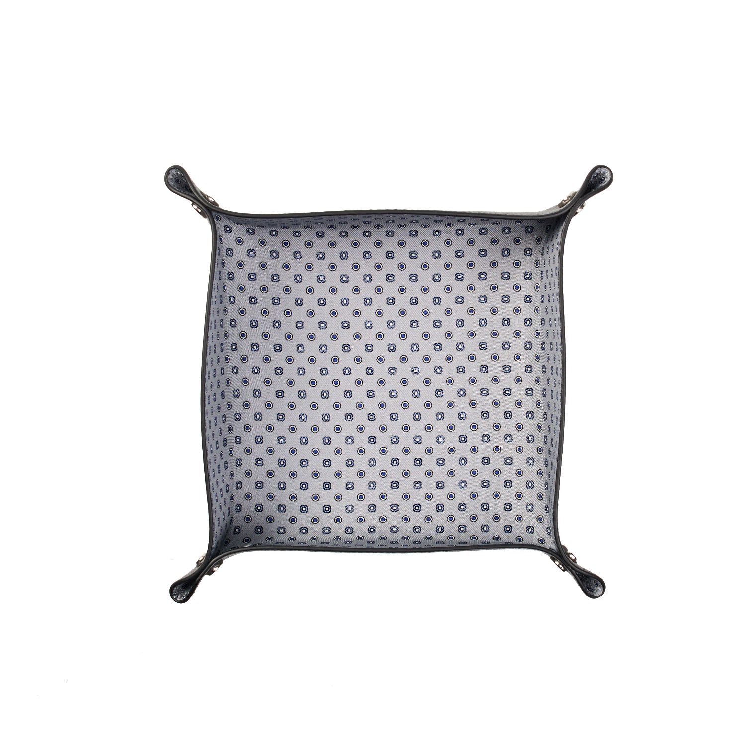 Large leather valet tray with a silk interior featuring the signature micro-pattern of the Maison. Corners secured by four metal rivets. A refined yet functional decorative item.
