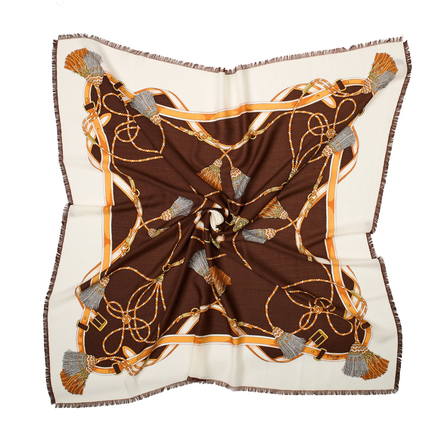 The E. Marinella women's stole, measuring 115 x 115 cm, is a sophisticated and versatile accessory made from wool, silk, and cashmere. Its lightweight, enveloping quality is enhanced by the collection's tassel and key design. The stole is hand-finished and can be worn effortlessly over outerwear or blazers.