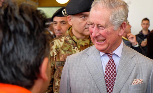 King Charles III of England wears a tie from the 1948 Archivio collection, the year of his birth, chosen by his wife Camilla during a visit to the Riviera di Chiaia store in 2017.