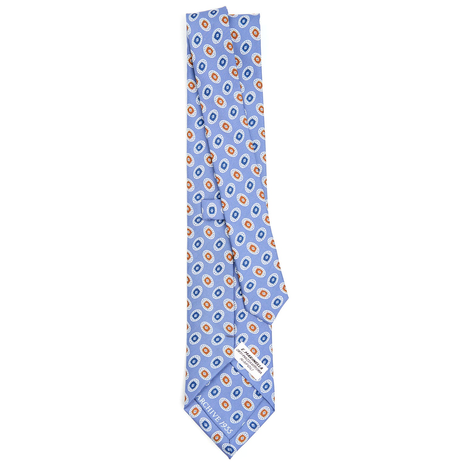 La cravatta fa parte della collezione Archivio, che propone in chiave moderna le stampe storiche dal 1930 al 1980. Le fantasie degli anni '50 sono caratterizzate da fantasie più piccole e fitte. Fa il suo ingresso il "fiorellino", elemento tipico delle fantasie Marinella. Un ritorno anche del paisley nella versione più tradizionale talvolta accostato apiccoli fiorellini, spesso tono su tono. Una cravatta classica con tocchi di originalità.