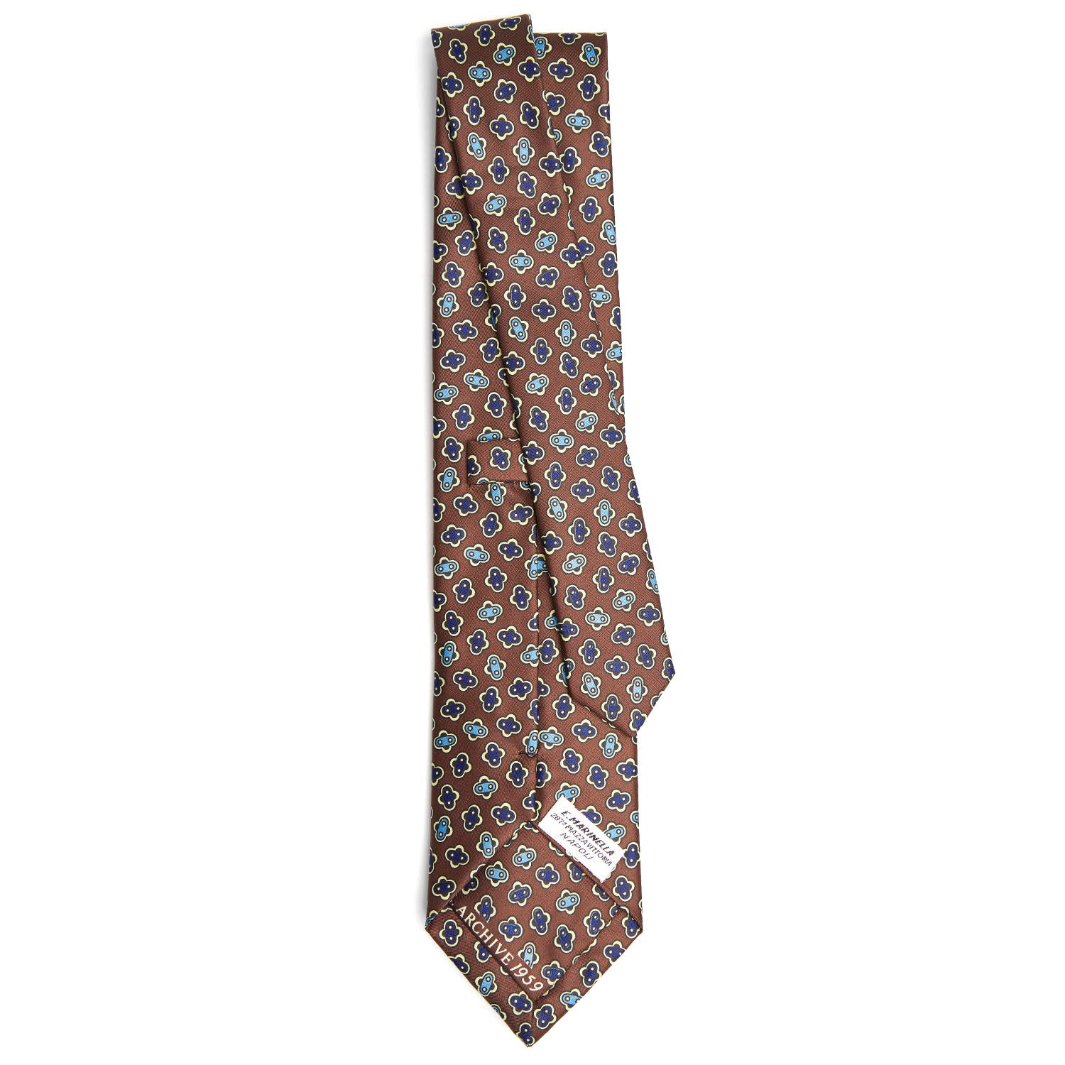 This tie is part of the Archivio collection which offers historical prints from the 1930s to the1980s in a modern way. The patterns of the 1950s are characterised by smaller, closer patterns. The "fiorellino" or little flower, a typical element of Marinella's designs, makes its entrance. There is also a return of paisley sometimes combined with small flowers, often tone on tone. A classic tie with touches of originality.