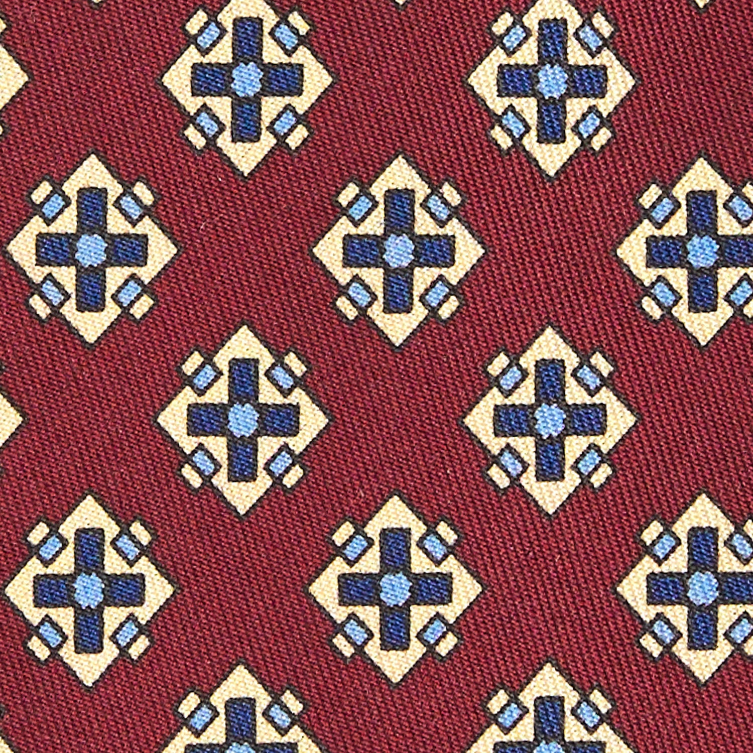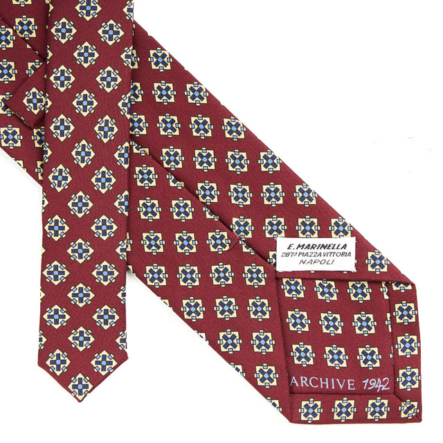La cravatta fa parte della collezione Archivio che propone, in chiave moderna, le stampe storiche dal 1930 al 1980 su tessuti di grammatura più leggera, come ad inizio secolo. Le fantasie degli anni '40 sono caratterizzate da colori sobri, con una predominanza di blue e bordeaux, talvolta illuminati dall'azzurro, e disegni importanti, risultato di una combinazione di piccoli disegni. Una cravatta che appare rigorosa.ma con un tocco comunque trendy.