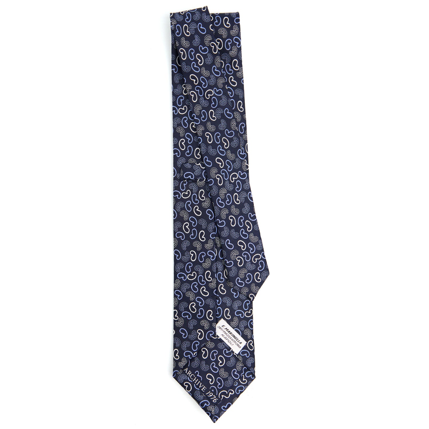 La cravatta fa parte della collezione Archivio, che propone in chiave moderna le stampe storiche dal 1930 al 1980. Gli anni '70 sono caratterizzati da motivi più vivaci e densi, a volte anche barocchi. I colori sono chiari con sprazzi di arancio, rosso brillante e bianco. Una cravatta dal carattere prepotente.