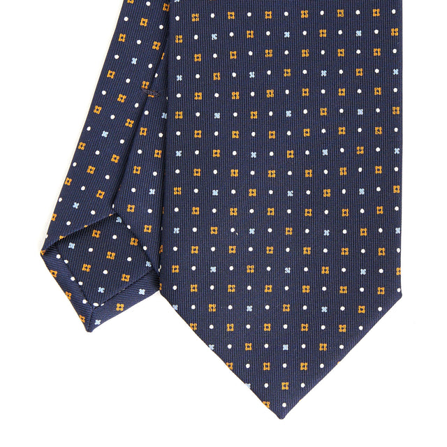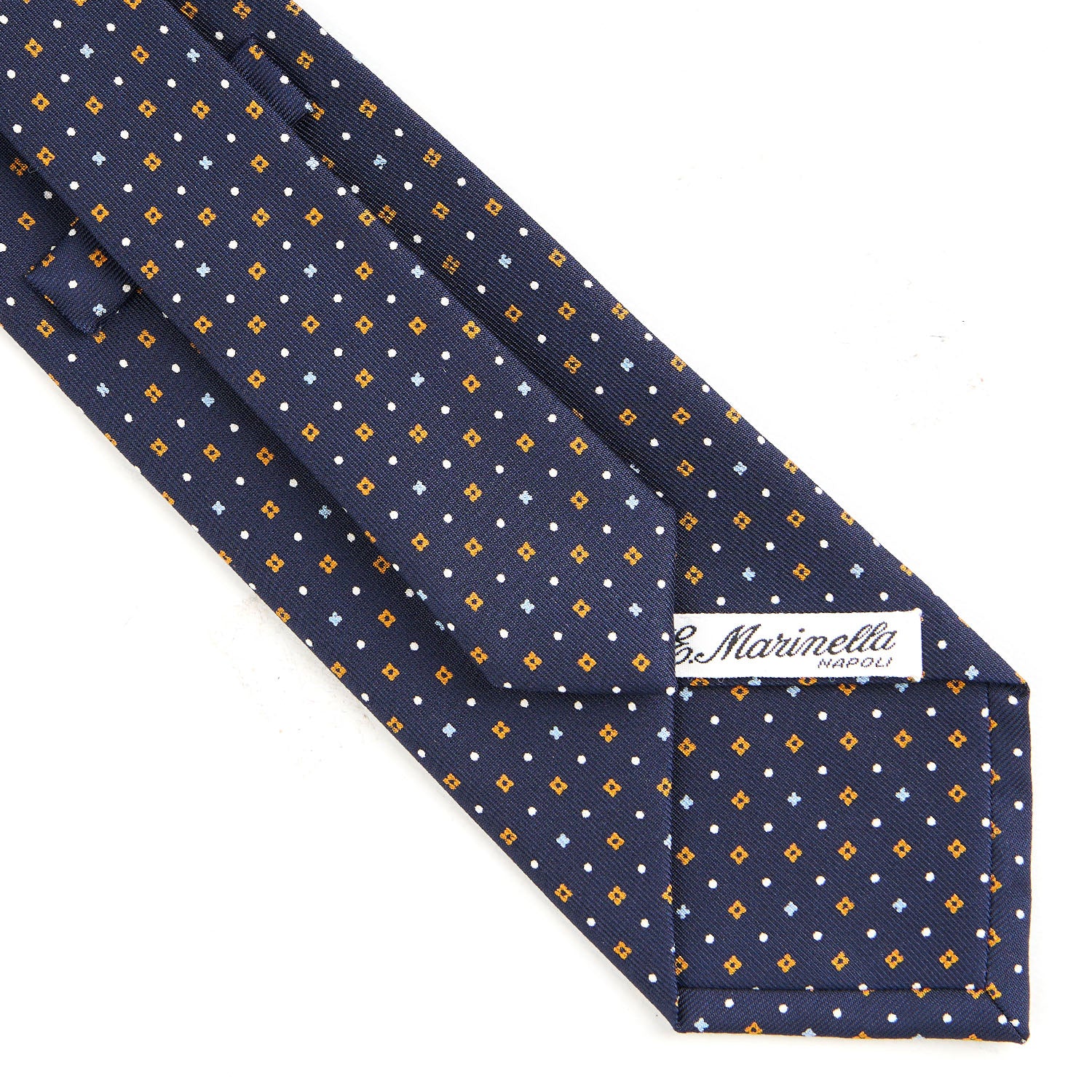 La cravatta E.Marinella è un prodotto totalmente artigianale. Dalla stampa a mano della seta al taglio singolo del tessuto, alla chiusura del prodotto finito. Caratterizzata da colori vivaci ma mai eccessivi e da microfantasie floreali e geometriche, si distingue anche per la fodera realizzata con lo stesso tessuto fantasia. Cravatta 3 pieghe