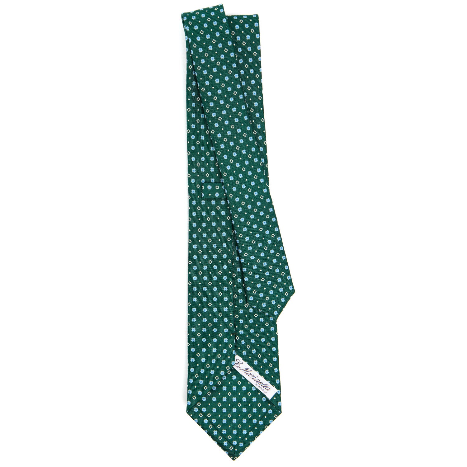 La cravatta E.Marinella è un prodotto totalmente artigianale. Dalla stampa a mano della seta al taglio singolo del tessuto, alla chiusura del prodotto finito. Caratterizzata da colori vivaci ma mai eccessivi e da microfantasie floreali e geometriche, si distingue anche per la fodera realizzata con lo stesso tessuto fantasia. Cravatta 3 pieghe
