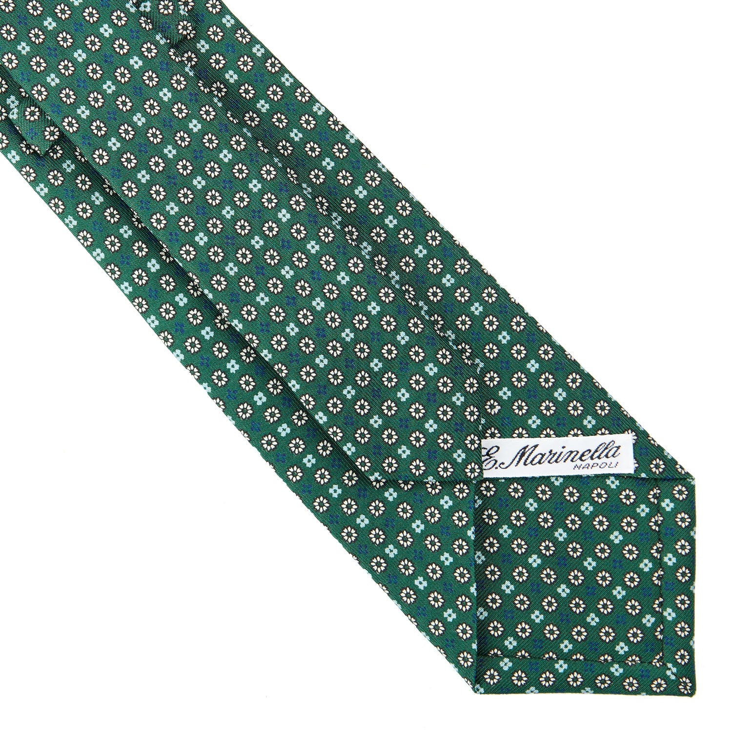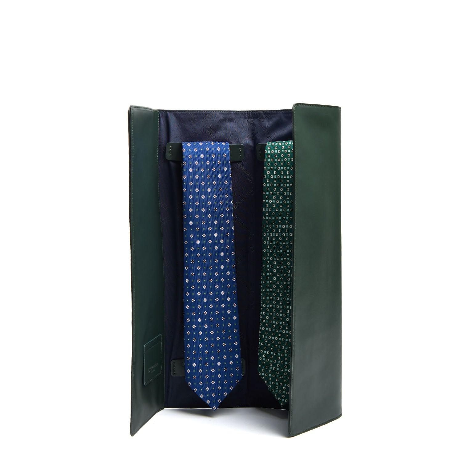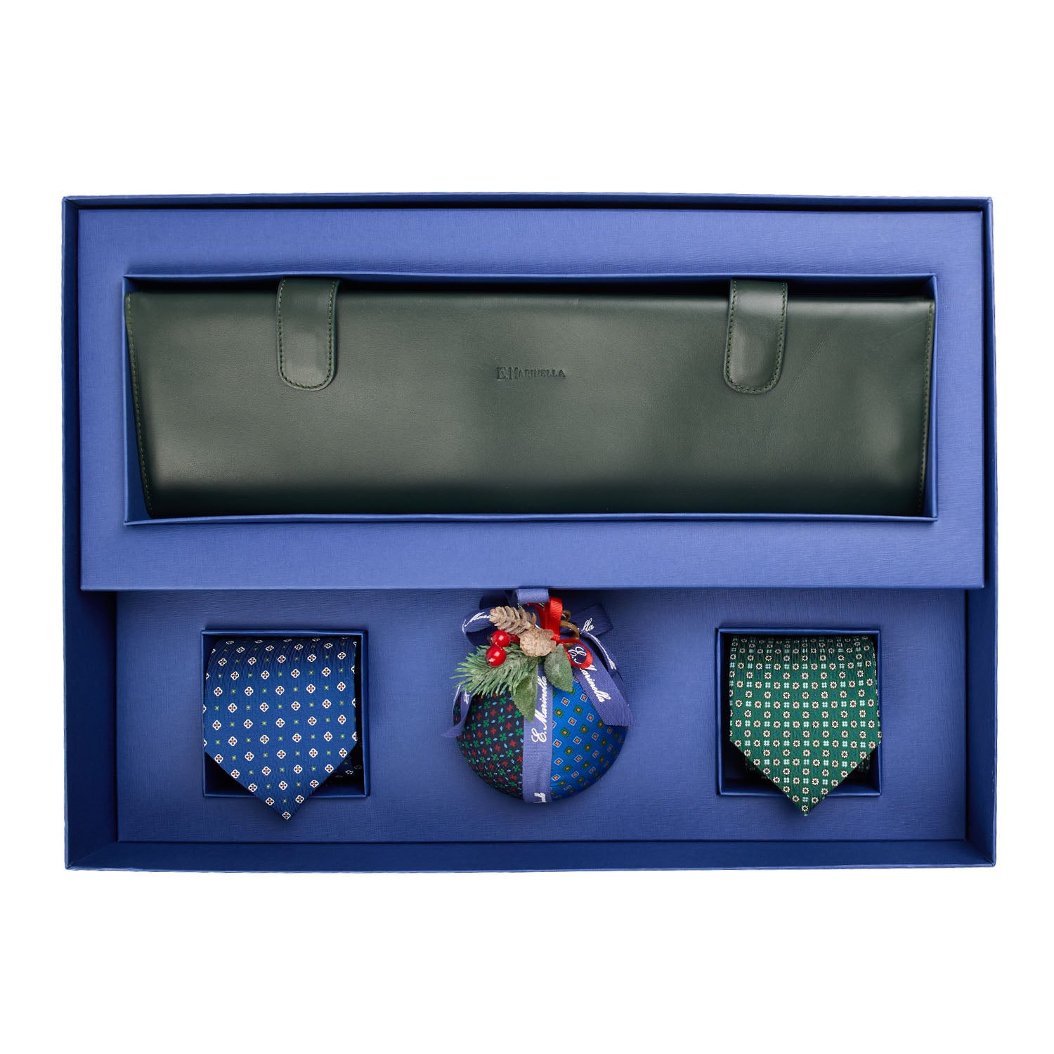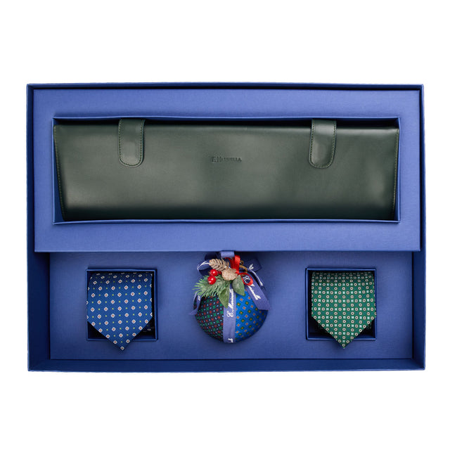 Il porta-cravatte, pratico e raffinato, custodisce con ordine i tuoi accessori, mentre le due cravatte sartoriali in seta, nei toni del blu e dell’azzurro con delicato motivo floreale, raccontano la versatilità e la discrezione dello stile Marinella. Ogni cravatta è realizzata secondo tecniche tradizionali, in cui il gesto della mano rimane protagonista.