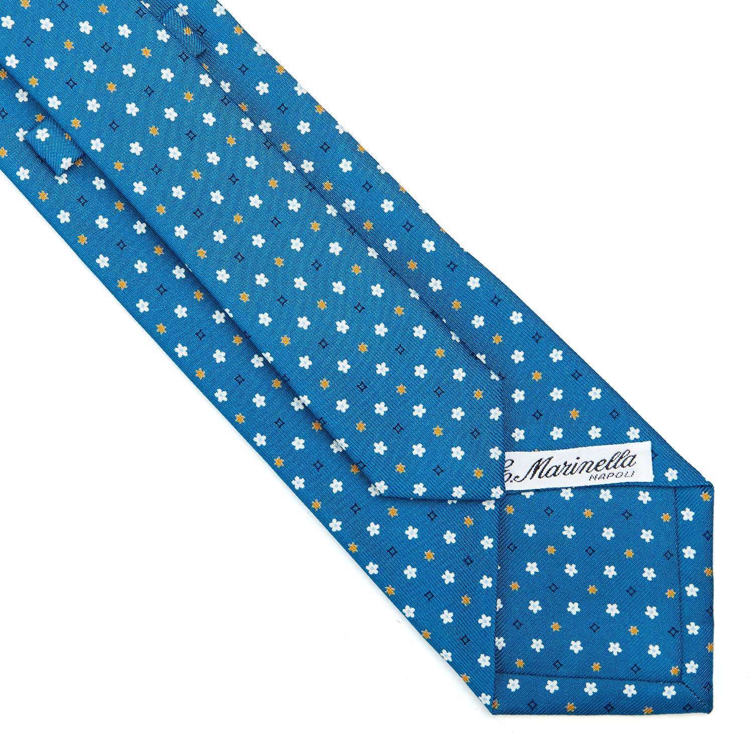 La cravatta E.Marinella è un prodotto totalmente artigianale. Dalla stampa a mano della seta al taglio singolo del tessuto, alla chiusura del prodotto finito. Caratterizzata da colori vivaci ma mai eccessivi e da microfantasie floreali e geometriche, si distingue anche per la fodera realizzata con lo stesso tessuto fantasia. Cravatta 3 pieghe