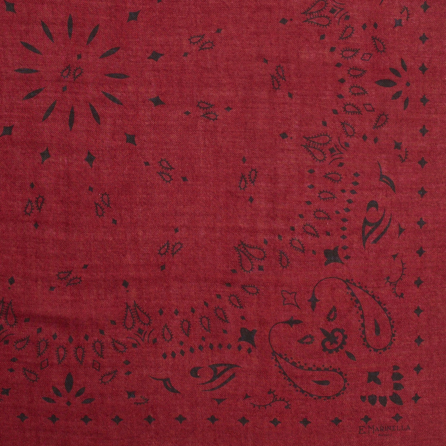 Foulard in lana, cashmere e seta con motivo bandana e bordi sfrangiati. Da indossare al collo con un look casual o per sdrammatizzare uno più formale.