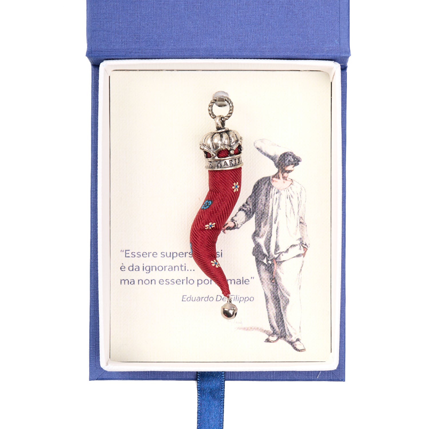 Il cornetto portafortuna E. Marinella è realizzato con le preziose sete stampate a mano della Maison, trasformando tessuti di alta qualità in amuleti di tradizione napoletana. Impreziositi da finiture in metallo argentato e presentati in raffinate confezioni regalo, i cornetti sono il perfetto simbolo di eleganza sartoriale e buon auspicio. Made in Italy