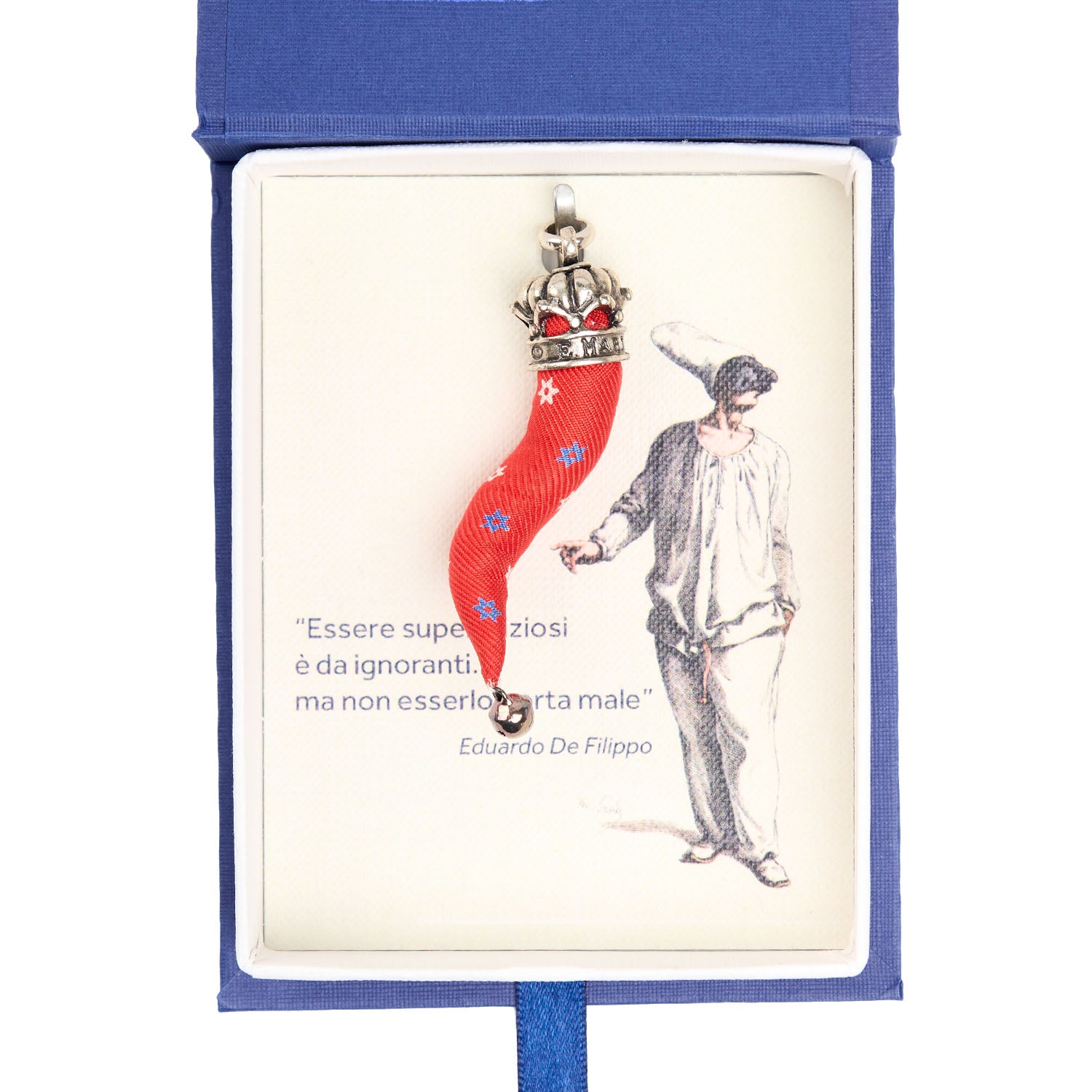 Il cornetto portafortuna E. Marinella è realizzato con le preziose sete stampate a mano della Maison, trasformando tessuti di alta qualità in amuleti di tradizione napoletana. Impreziositi da finiture in metallo argentato e presentati in raffinate confezioni regalo, i cornetti sono il perfetto simbolo di eleganza sartoriale e buon auspicio. Made in Italy