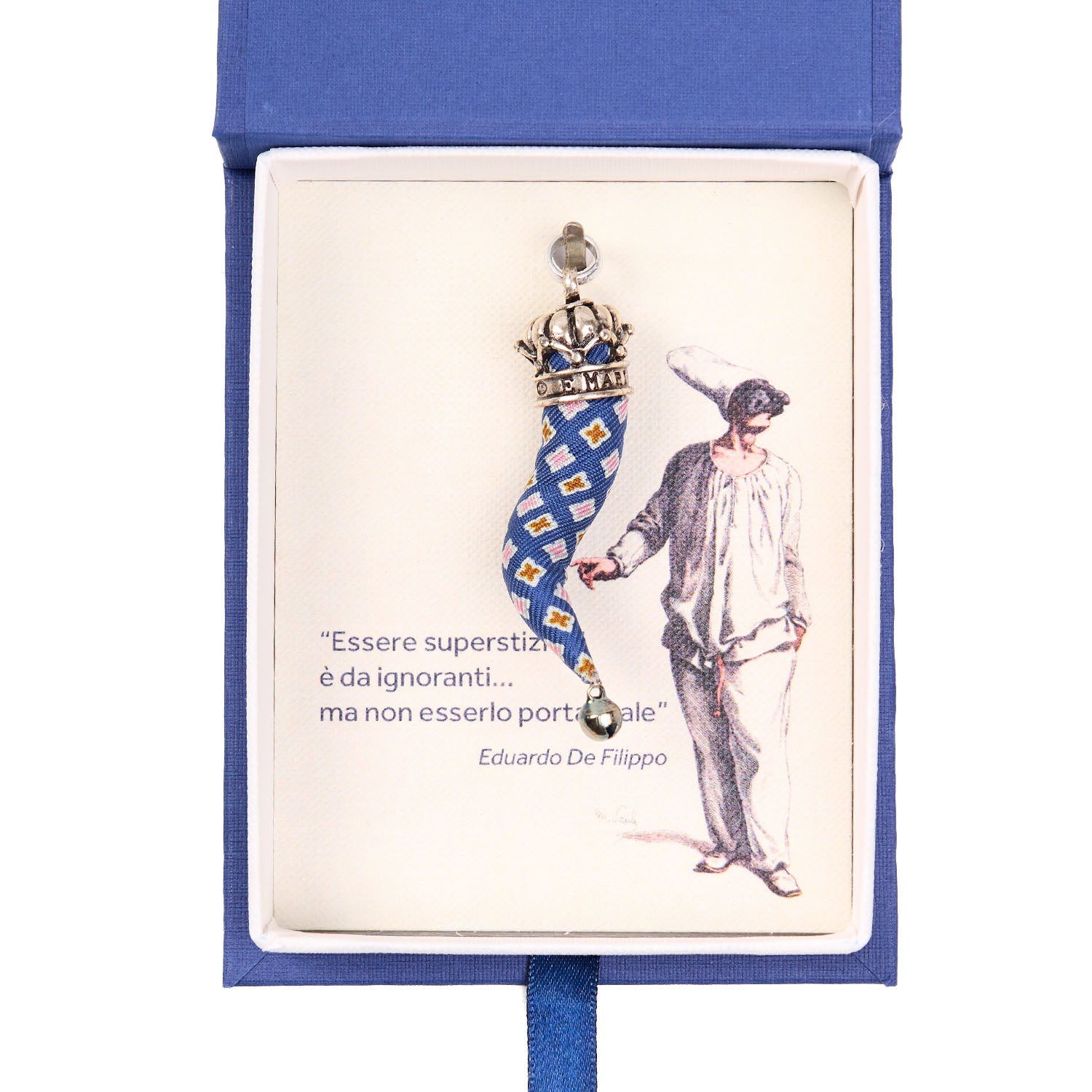 Il cornetto portafortuna E. Marinella è realizzato con le preziose sete stampate a mano della Maison, trasformando tessuti di alta qualità in amuleti di tradizione napoletana. Impreziositi da finiture in metallo argentato e presentati in raffinate confezioni regalo, i cornetti sono il perfetto simbolo di eleganza sartoriale e buon auspicio. Made in Italy