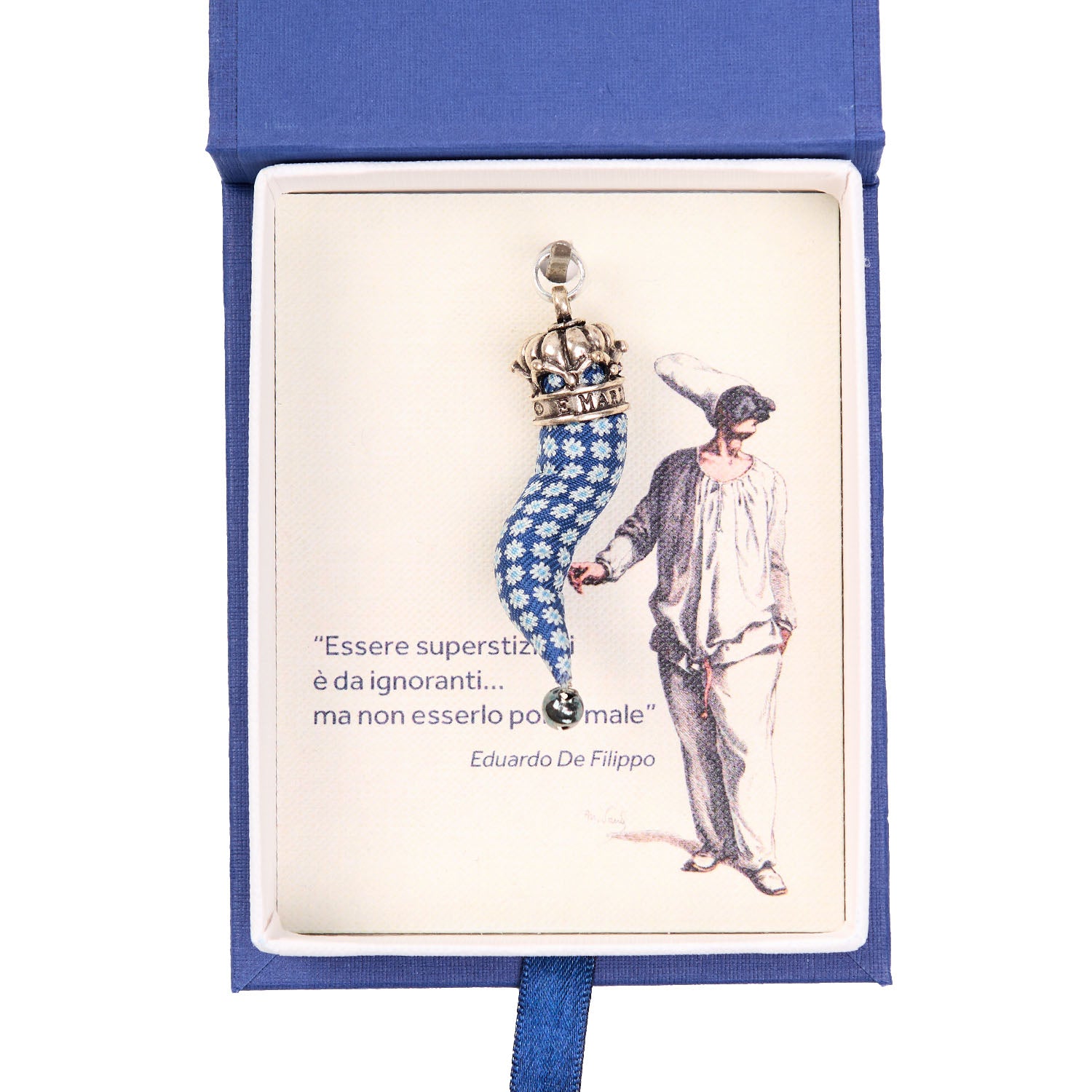 Il cornetto portafortuna E. Marinella è realizzato con le preziose sete stampate a mano della Maison, trasformando tessuti di alta qualità in amuleti di tradizione napoletana. Impreziositi da finiture in metallo argentato e presentati in raffinate confezioni regalo, i cornetti sono il perfetto simbolo di eleganza sartoriale e buon auspicio. Made in Italy