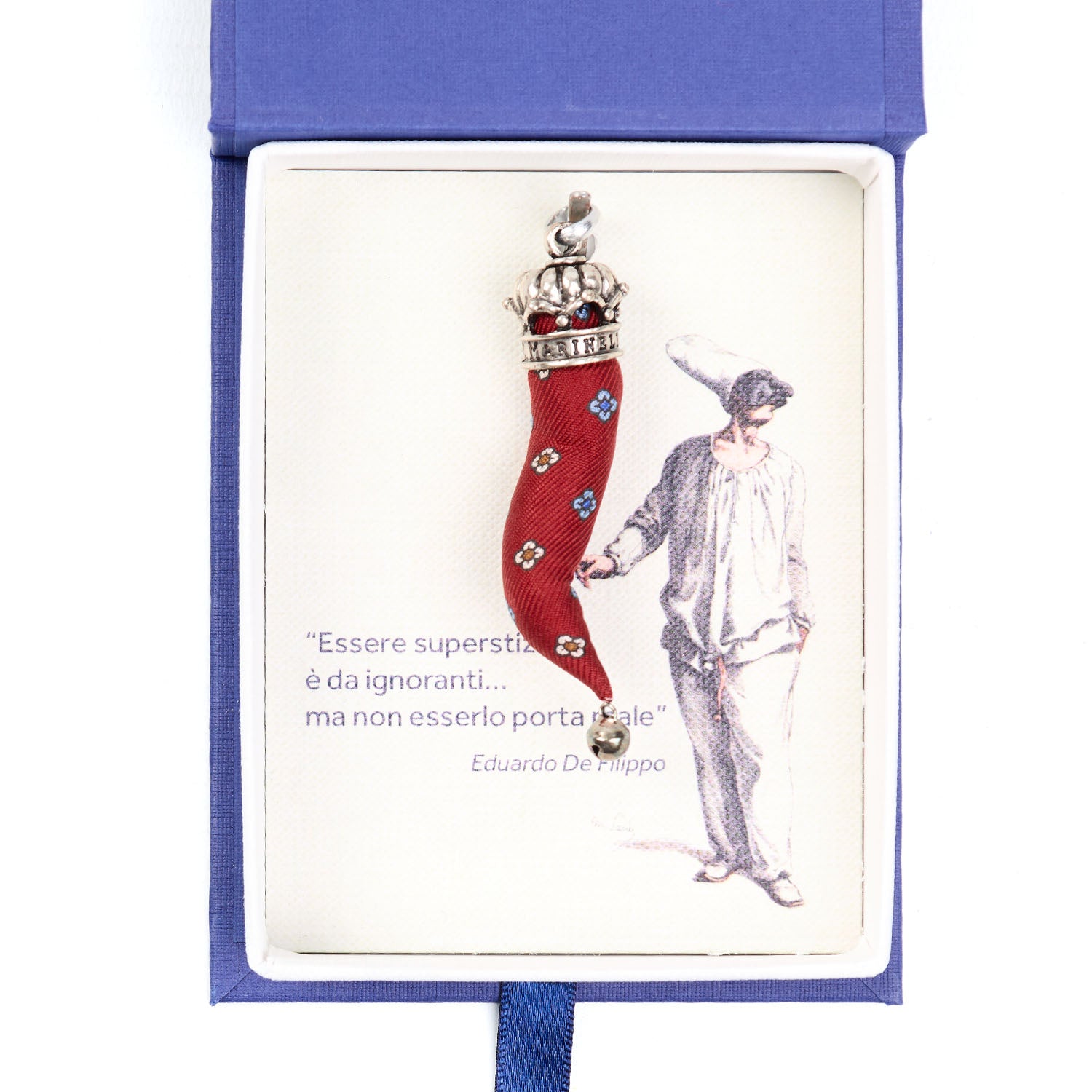 Il cornetto portafortuna E. Marinella è realizzato con le preziose sete stampate a mano della Maison, trasformando tessuti di alta qualità in amuleti di tradizione napoletana. Impreziositi da finiture in metallo argentato e presentati in raffinate confezioni regalo, i cornetti sono il perfetto simbolo di eleganza sartoriale e buon auspicio. Made in Italy