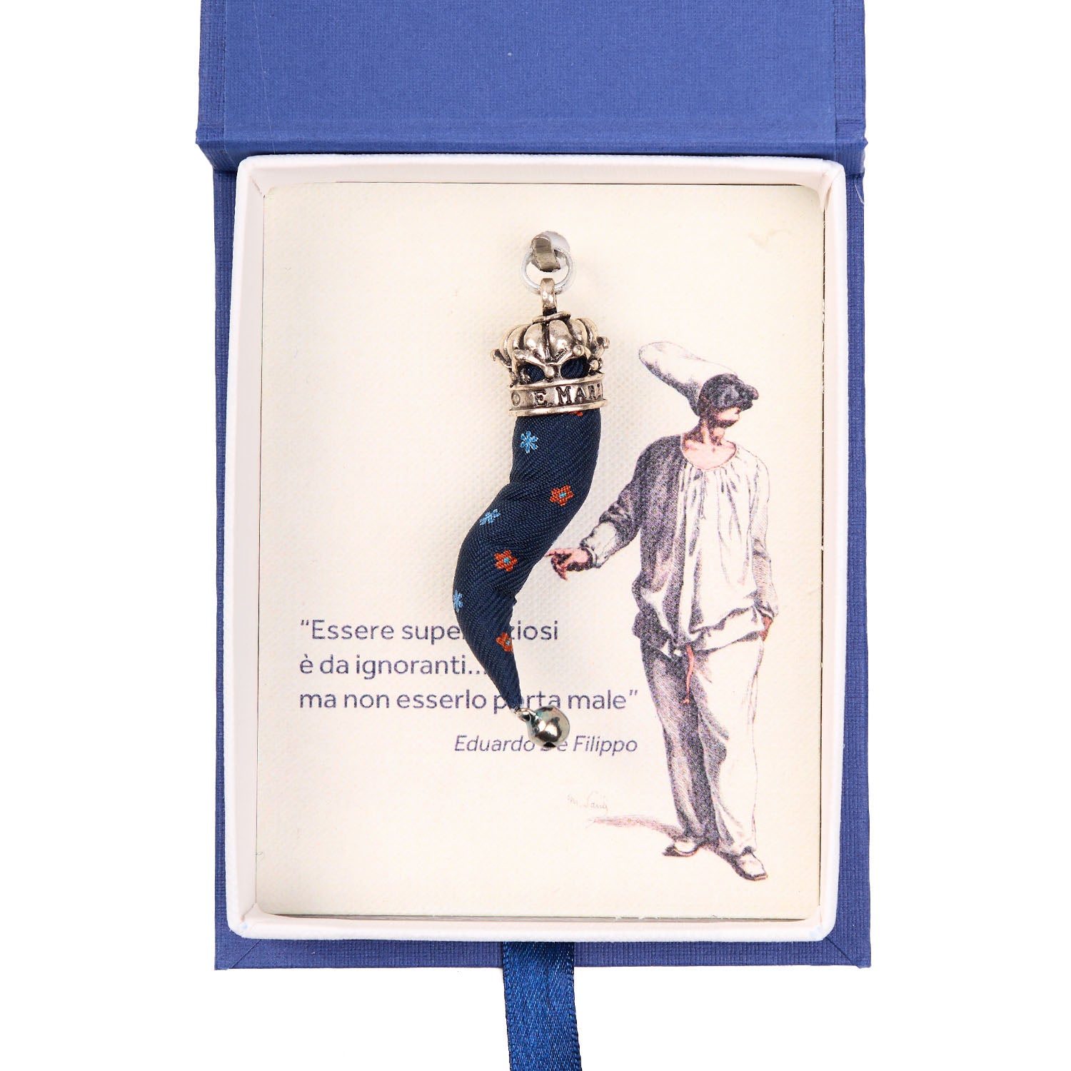 Il cornetto portafortuna E. Marinella è realizzato con le preziose sete stampate a mano della Maison, trasformando tessuti di alta qualità in amuleti di tradizione napoletana. Impreziositi da finiture in metallo argentato e presentati in raffinate confezioni regalo, i cornetti sono il perfetto simbolo di eleganza sartoriale e buon auspicio. Made in Italy