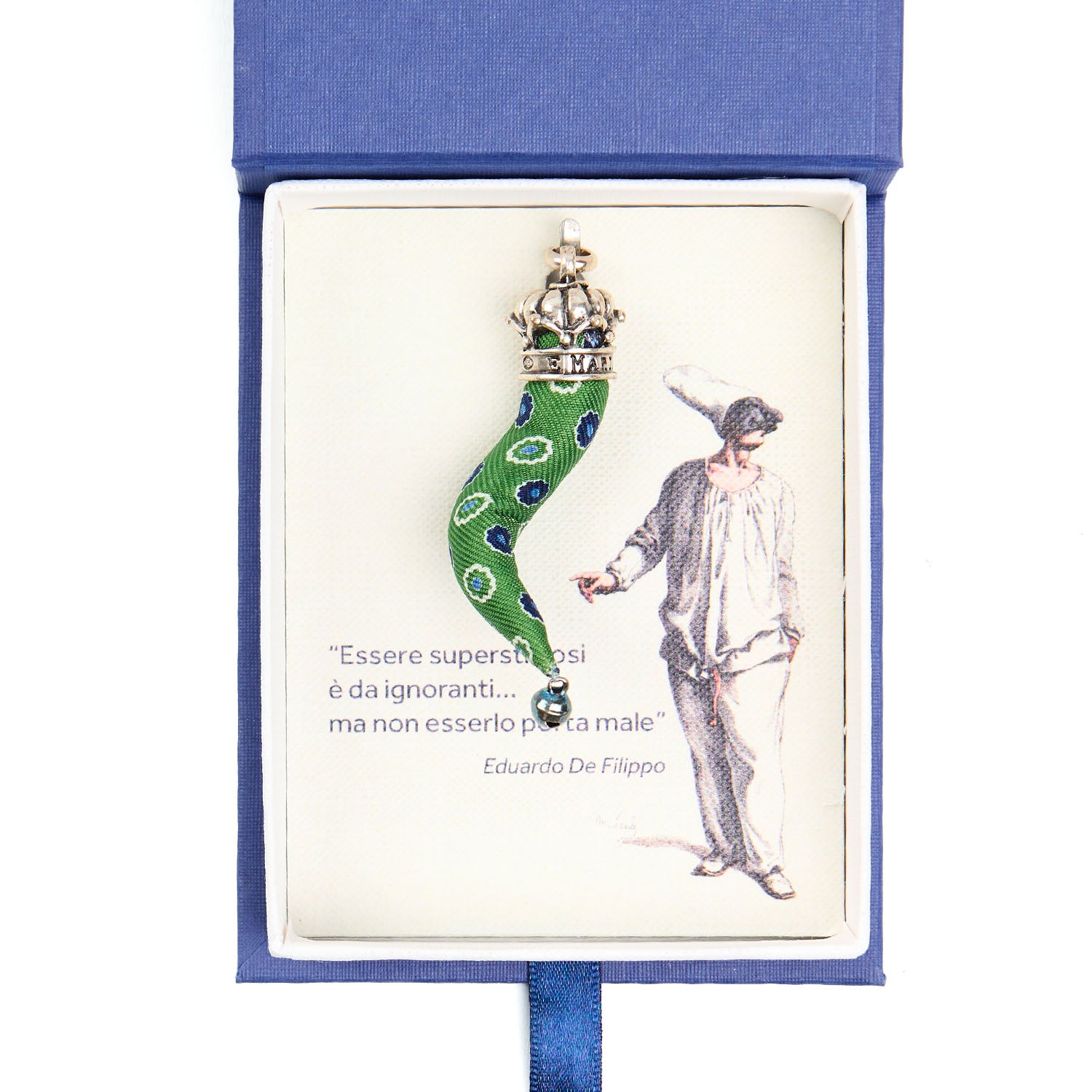 Il cornetto portafortuna E. Marinella è realizzato con le preziose sete stampate a mano della Maison, trasformando tessuti di alta qualità in amuleti di tradizione napoletana. Impreziositi da finiture in metallo argentato e presentati in raffinate confezioni regalo, i cornetti sono il perfetto simbolo di eleganza sartoriale e buon auspicio. Made in Italy