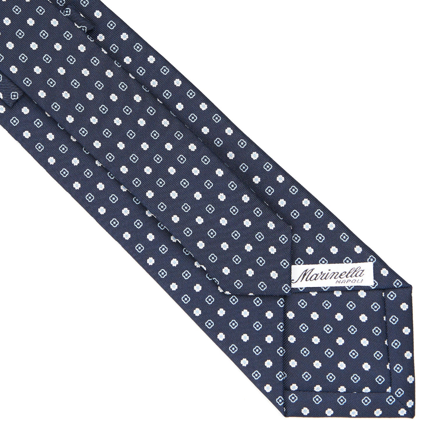La cravatta E.Marinella è un prodotto totalmente artigianale. Dalla stampa a mano della seta al taglio singolo del tessuto, alla chiusura del prodotto finito. Caratterizzata da colori vivaci ma mai eccessivi e da microfantasie floreali e geometriche, si distingue anche per la fodera realizzata con lo stesso tessuto fantasia. Cravatta 3 pieghe