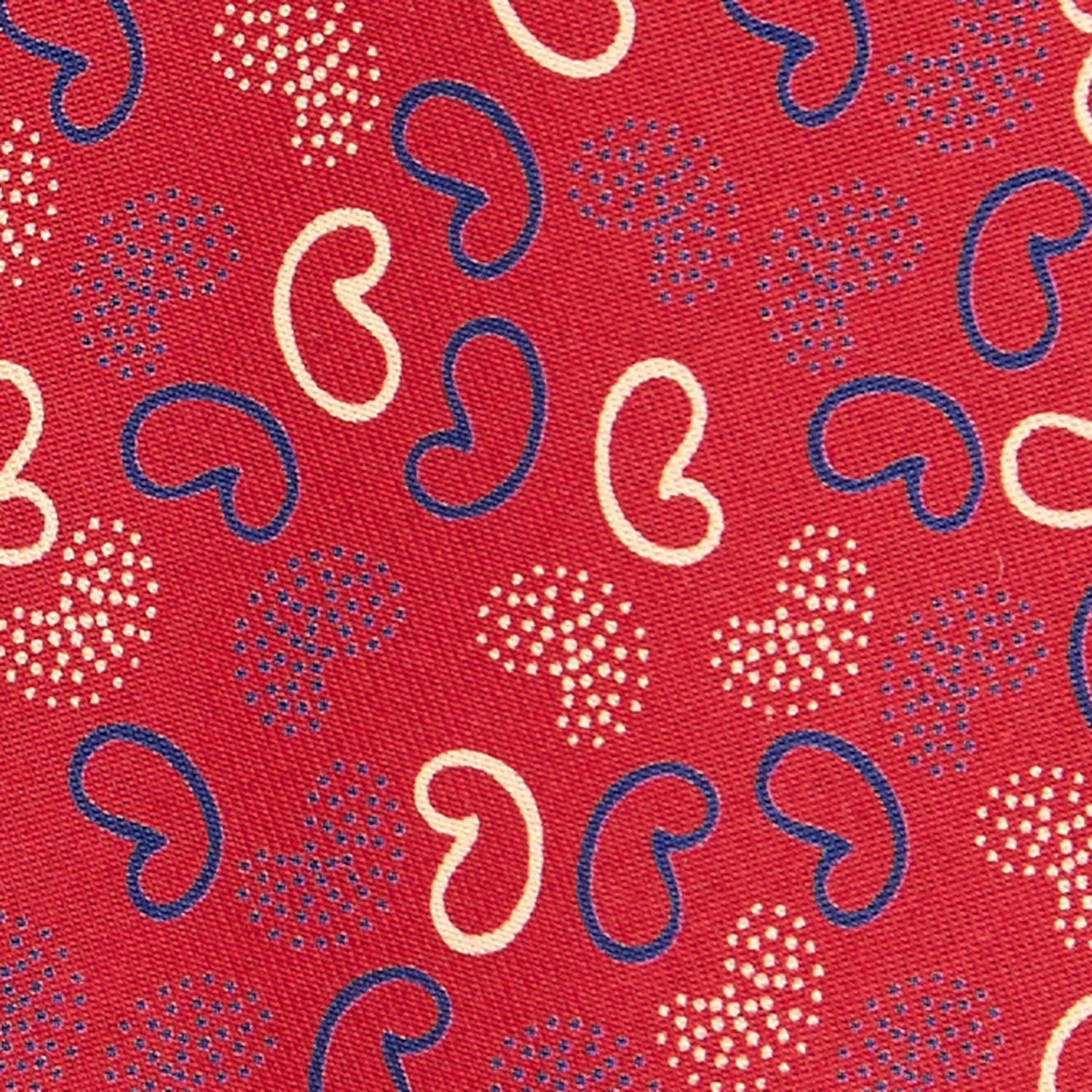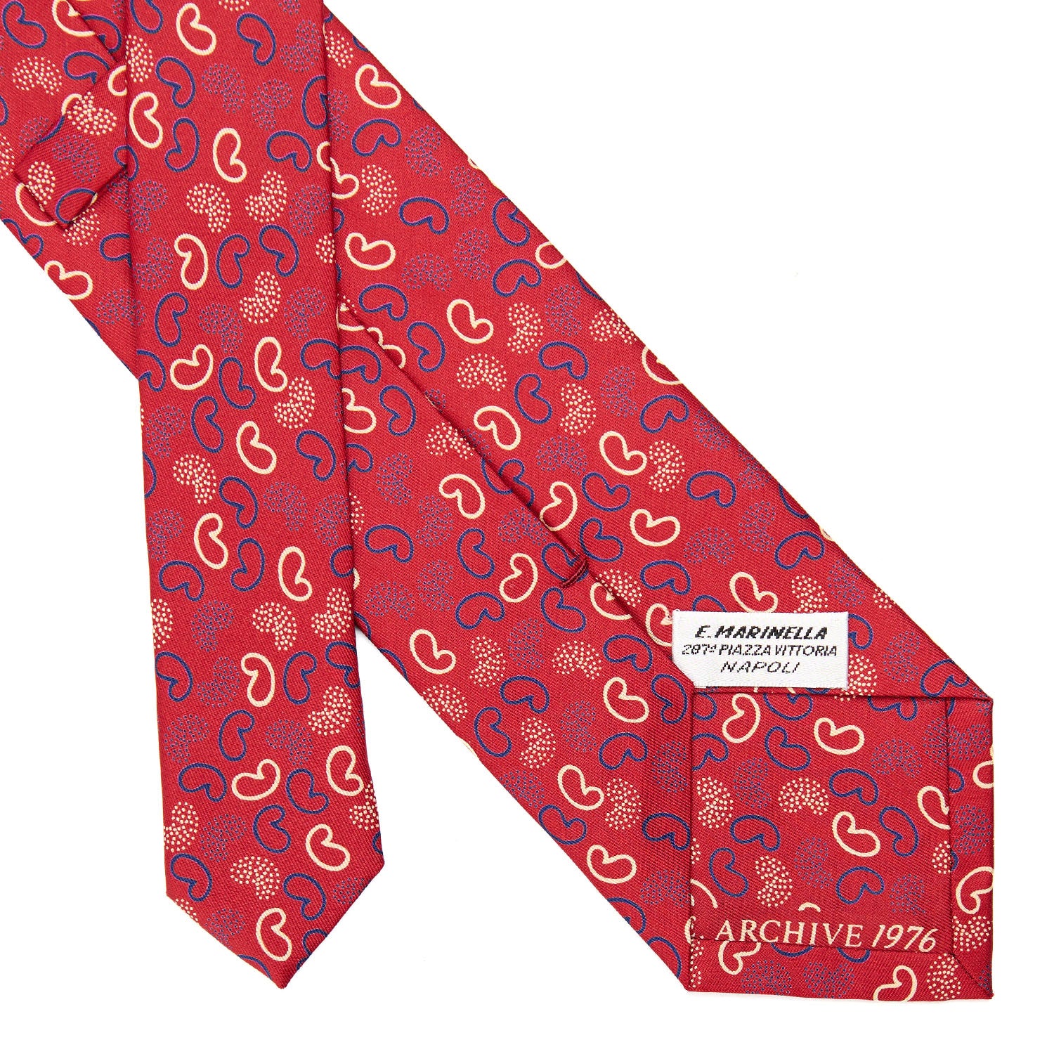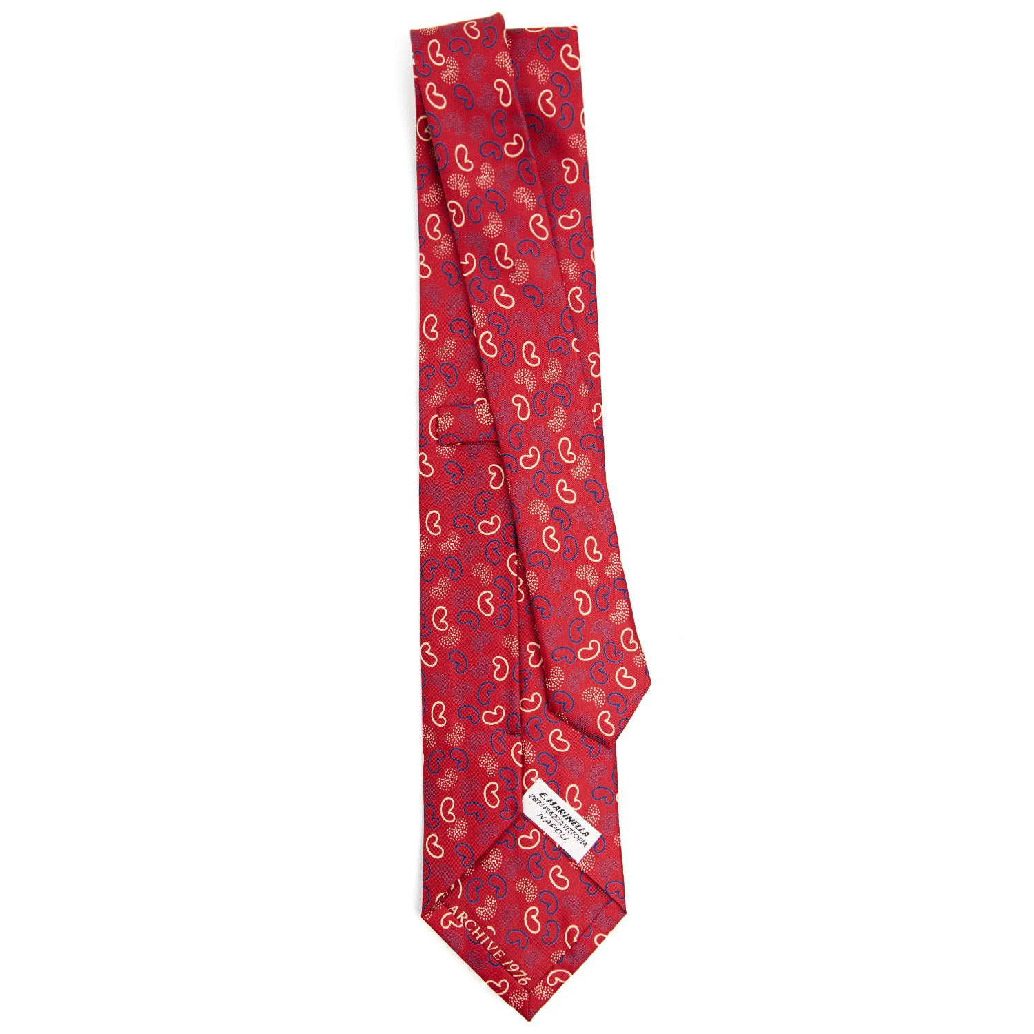 La cravatta fa parte della collezione Archivio, che propone in chiave moderna le stampe storiche dal 1930 al 1980. Gli anni '70 sono caratterizzati da motivi più vivaci e densi, a volte anche barocchi. I colori sono chiari con sprazzi di arancio, rosso brillante e bianco. Una cravatta dal carattere prepotente.