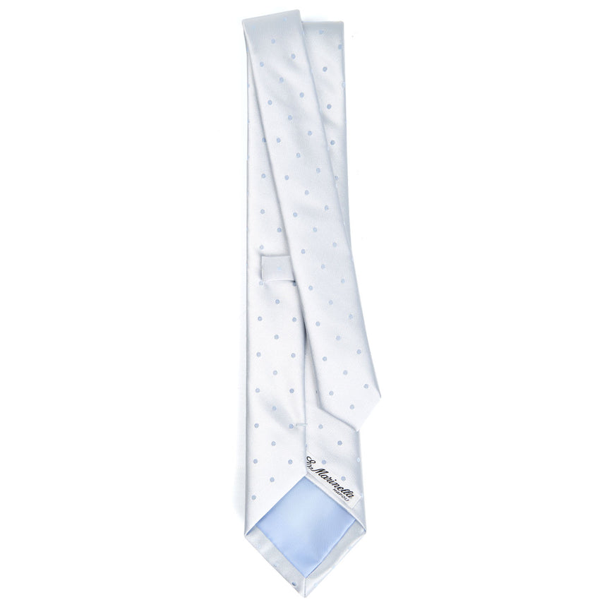 La cravatta in raso di seta è interamente realizzata a mano. Grazie alla lucentezza naturale della seta conferisce un effetto liscio dall'aspetto cangiante. La cravatta è arricchita da disegno pois ed è consigliata per cerimonia di giorno in contesto formale. Ideale per lo sposo che sceglie uno stile classico, per i padri degli sposi ed anche i testimoni. Cravatta 3-pieghe