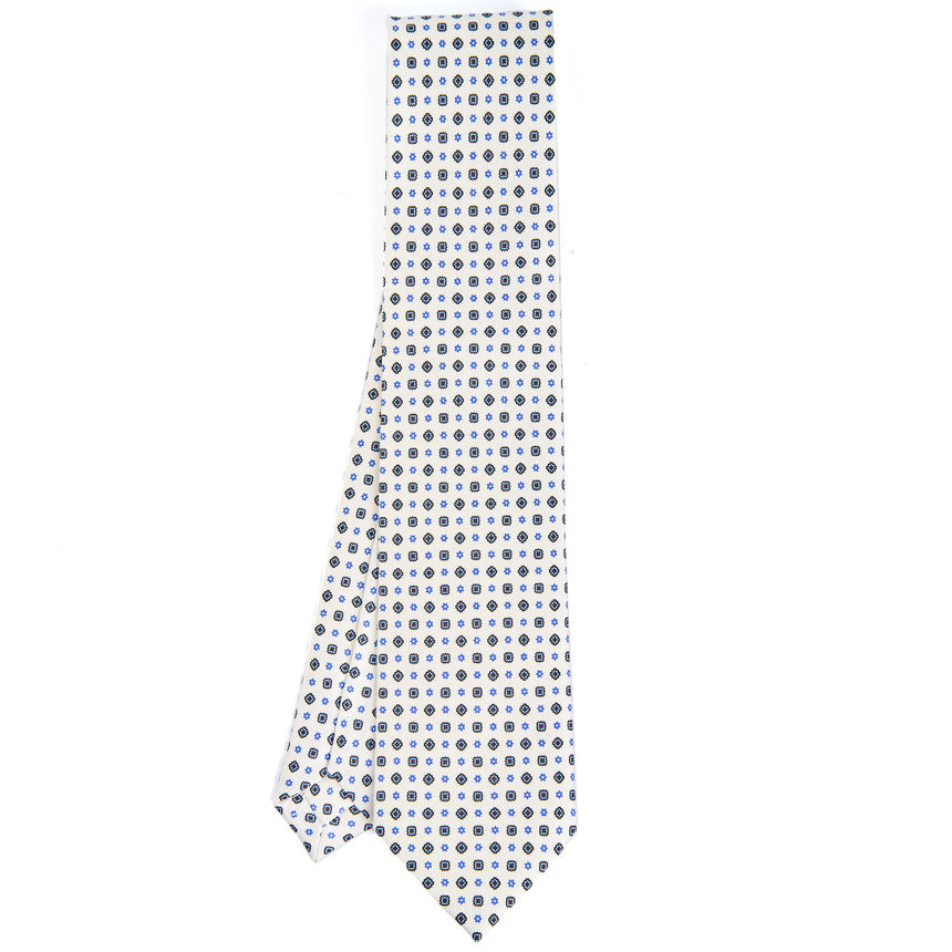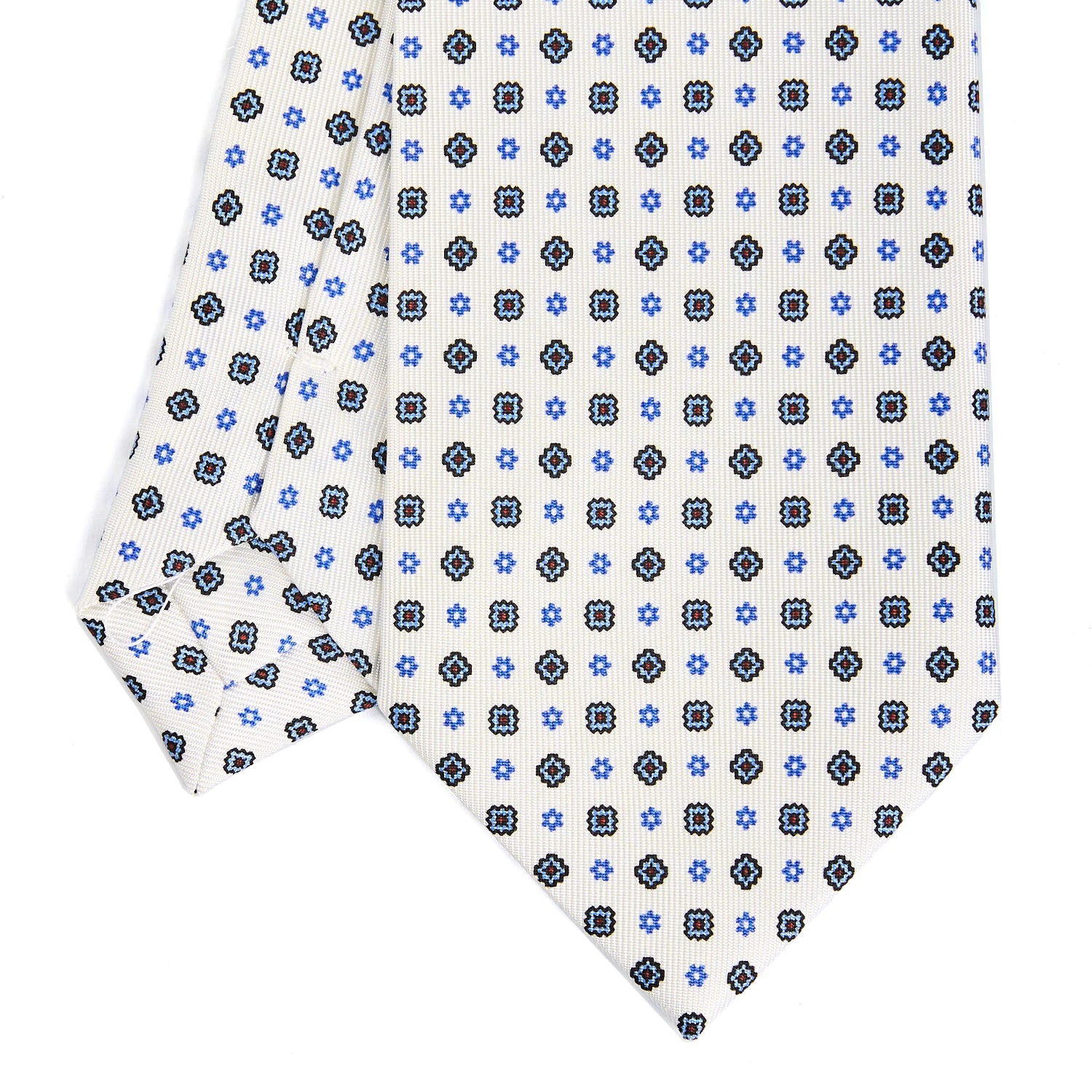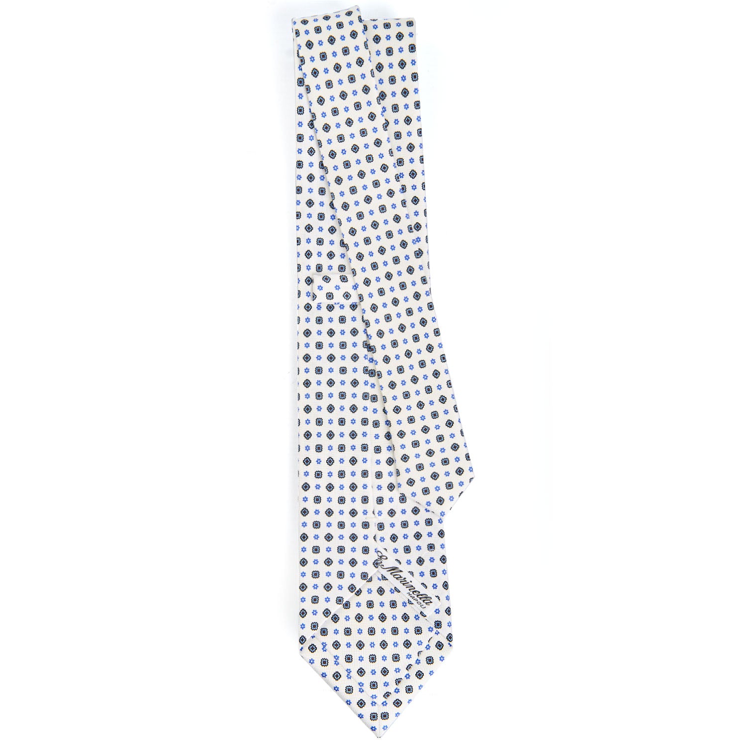 La cravatta E.Marinella è un prodotto totalmente artigianale. Dalla stampa a mano della seta al taglio singolo del tessuto, alla chiusura del prodotto finito. Caratterizzata da colori vivaci ma mai eccessivi e da microfantasie floreali e geometriche, si distingue anche per la fodera realizzata con lo stesso tessuto fantasia. Cravatta 3 pieghe