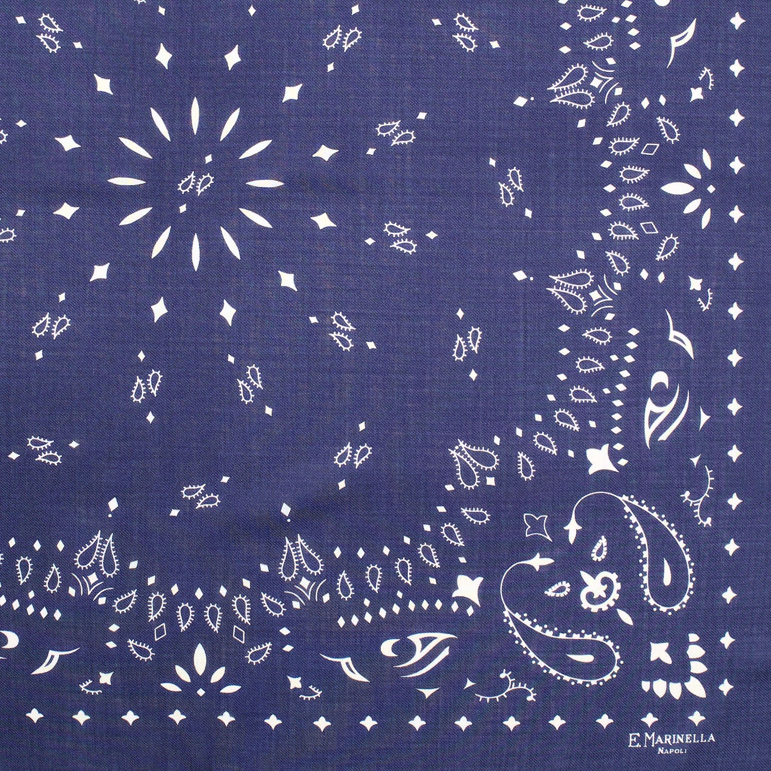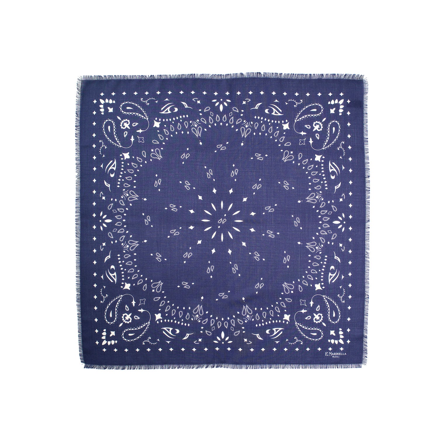 Foulard in lana, cashmere e seta con motivo bandana e bordi sfrangiati. Da indossare al collo con un look casual o per sdrammatizzare uno più formale.