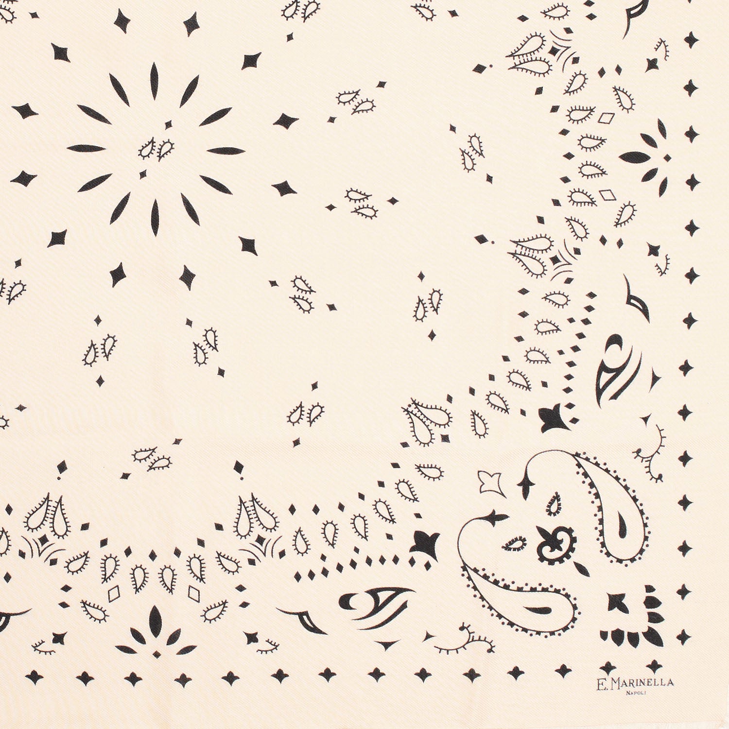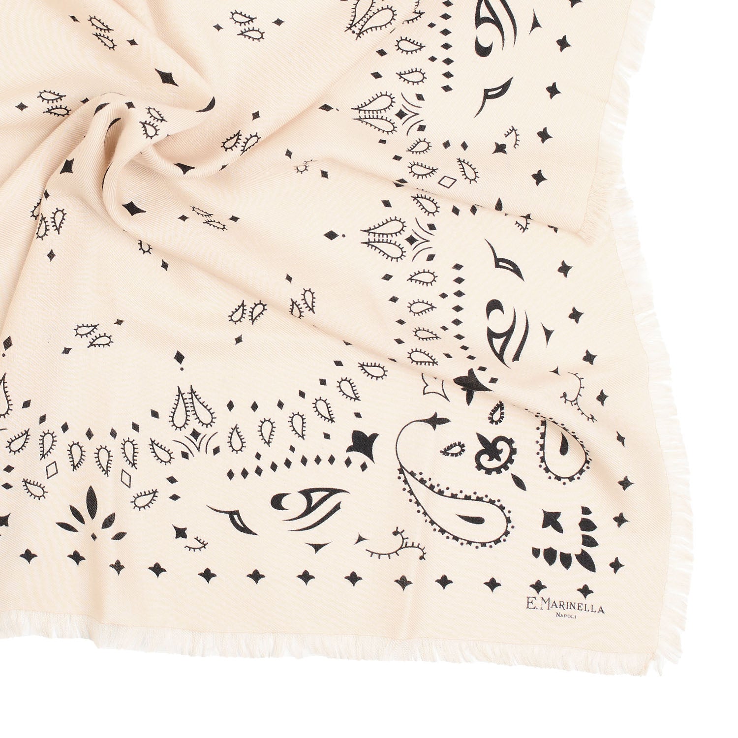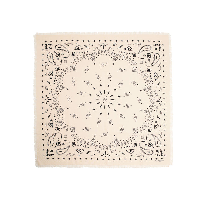 Foulard in lana, cashmere e seta con motivo bandana e bordi sfrangiati. Da indossare al collo con un look casual o per sdrammatizzare uno più formale.