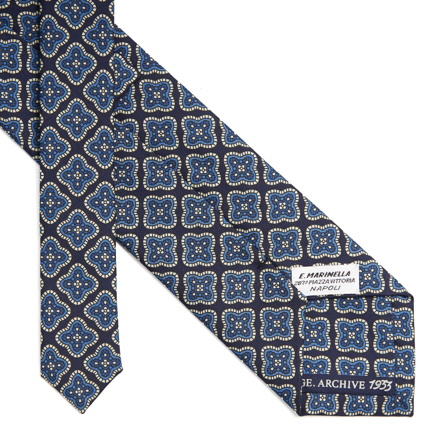 La cravatta fa parte della collezione Archivio che propone, in chiave moderna, le stampe storiche dal 1930 al 1980 su tessuti di grammatura più leggera, come ad inizio secolo. Le fantasie degli anni '30 sono caratterizzate da disegni grandi. "caramelloni" e colori sobri. Una cravatta dal gusto retrò ma contemporanea nell'anima.