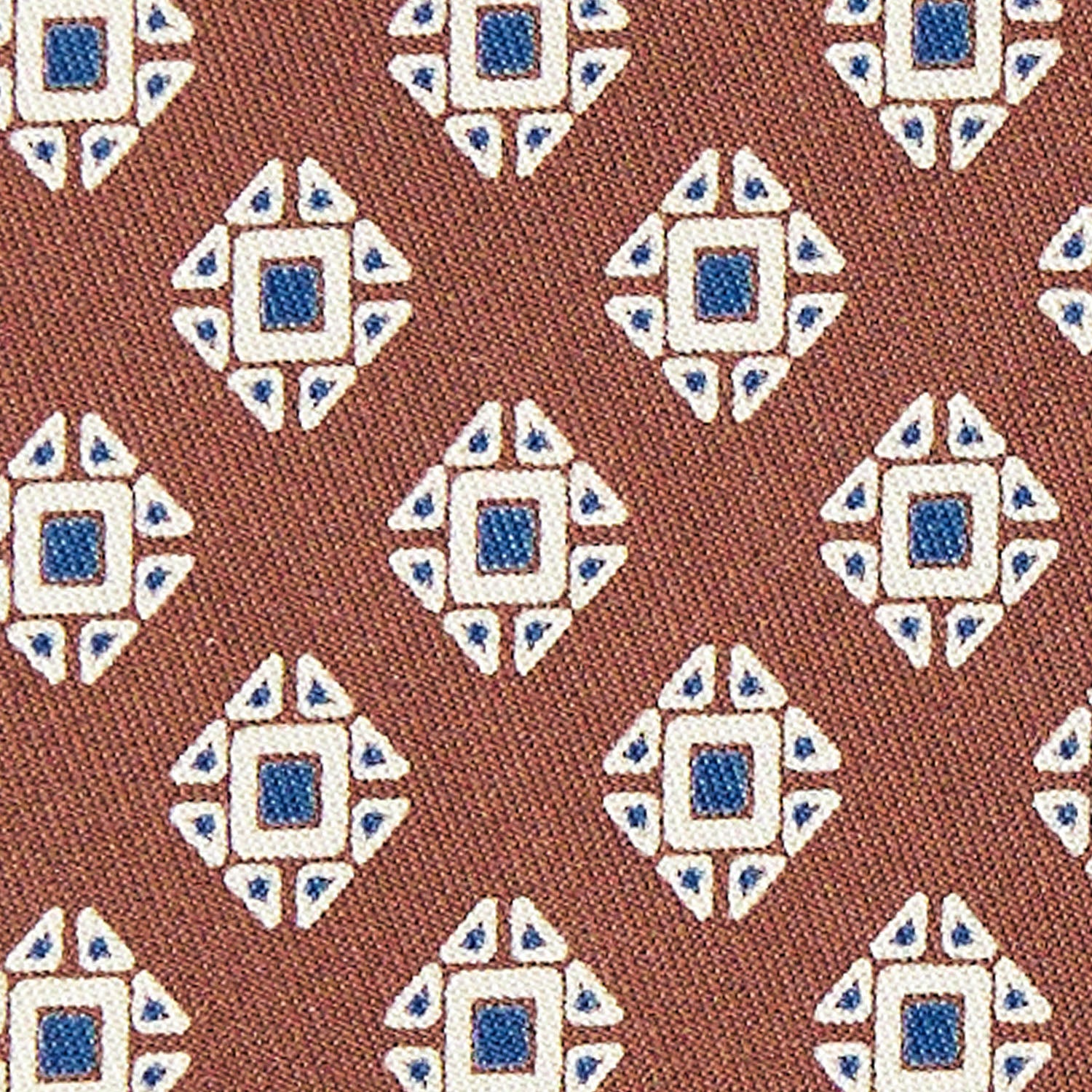 La cravatta fa parte della collezione Archivio che propone, in chiave moderna, le stampe storiche dal 1930 al 1980 su tessuti di grammatura più leggera, come ad inizio secolo. Le fantasie degli anni '40 sono caratterizzate da colori sobri, con una predominanza di blue e bordeaux, talvolta illuminati dall'azzurro, e disegni importanti, risultato di una combinazione di piccoli disegni. Una cravatta che appare rigorosa.ma con un tocco comunque trendy.