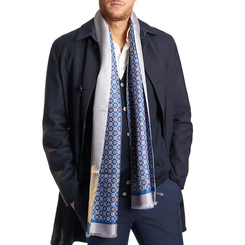Raffinata sciarpa tubolare in twill di seta in versione double con due fantasie a contrasto per dare un tocco di originalità. Da un lato tinta unita, dall'altro con fantasia fiore e piccola frangia finale. Morbida, leggera ed elegante, da indossare tutti i giorni o, se abbinata in modo particolare, nelle occasioni speciali.