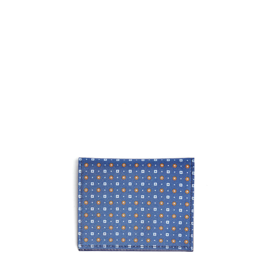 La seta microfantasia stampata a mano impreziosisce e rende unico questo piccolo accessorio comodo e compatto, arricchendone di colore e contrasti la base in pelle. Il prodotto è realizzato completamente a mano.