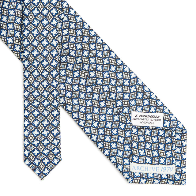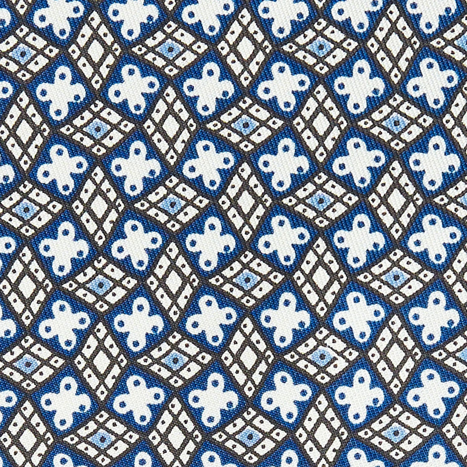 La cravatta fa parte della collezione Archivio, che propone in chiave moderna le stampe storiche dal 1930 al 1980. Gli anni '70 sono caratterizzati da motivi più vivaci e densi, a volte anche barocchi. I colori sono chiari con sprazzi di arancio, rosso brillante e bianco. Una cravatta dal carattere prepotente.